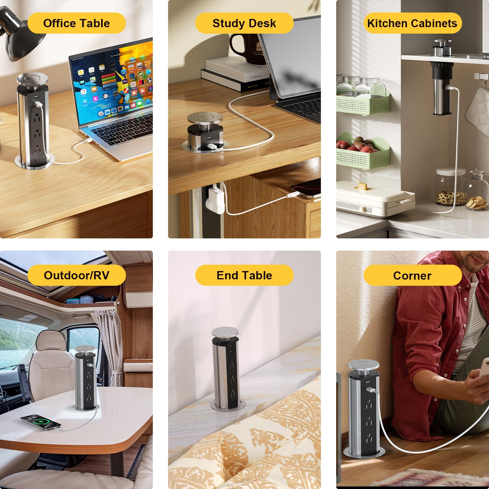 • Countertop Outlet, It's a great solution for you to use your electronics on tabletop, and also want to keep it clean and efficient.