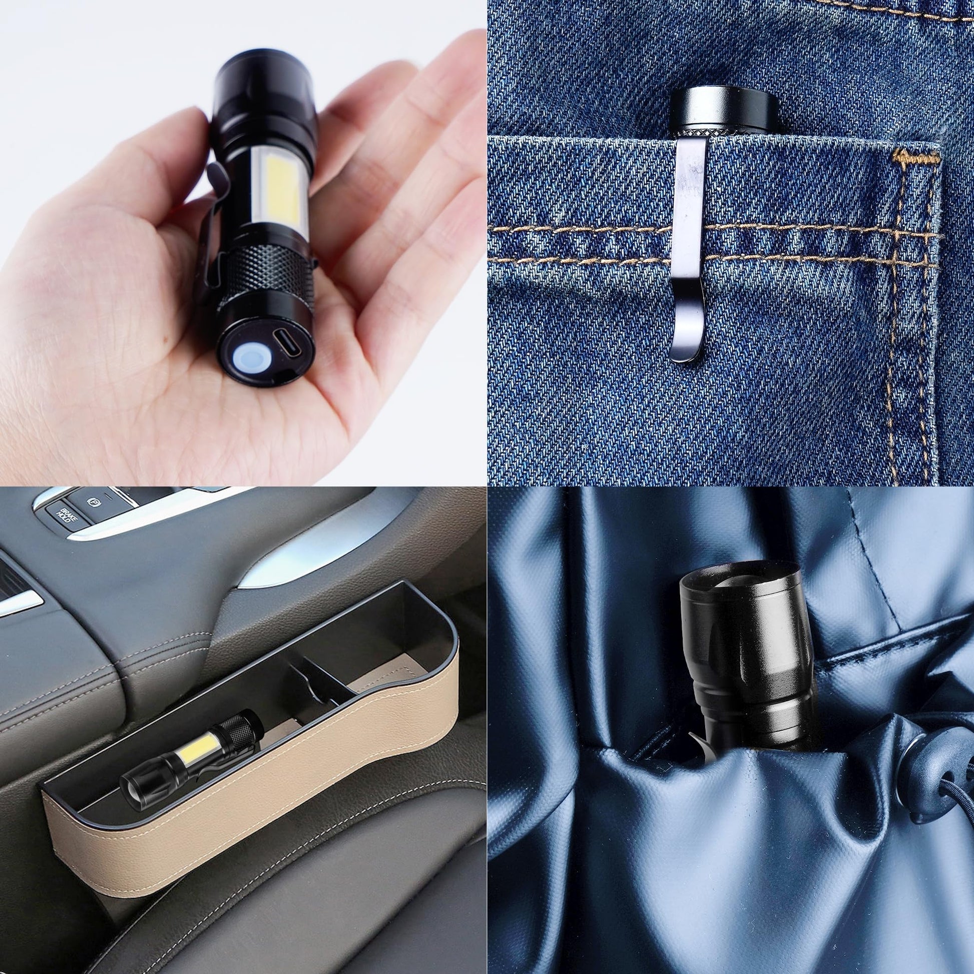 • Portable Small Flashlights: Small rechargeable flashlight with side COB light is 3.7 inches long and compact enough to put in pockets