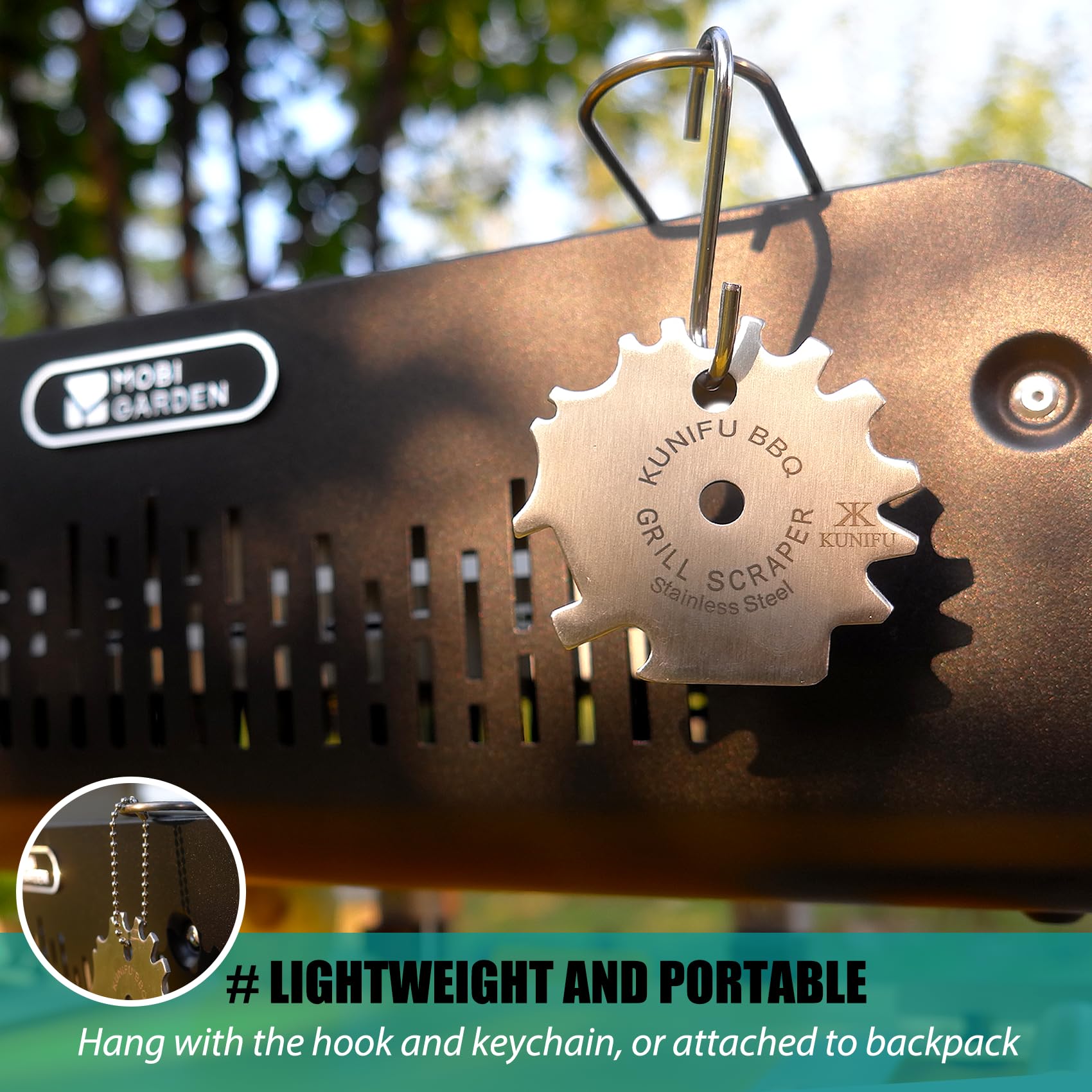 • Compact and Convenient - Come from gifts packages, includes Grate Grill Scraper, hanging hook and chain. Lightweight and portable, can be hooked with the keychain, or attached to the backpack when you go camping or hiking.