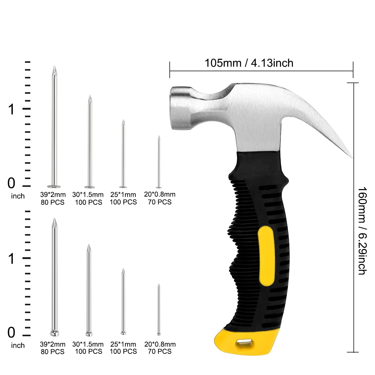 • RATIONAL SIZE ASSORTMENT – You will receive 560pcs nails of different sizes and types: there are 280pcs galvanized picture hanging nails and 280pcs galvanized finishing headless nails in 0.75in,1in,1.18in,1-1/2in sizes. The mini hammer included in this set has excellent performance in various projects, especially in narrow spaces. Thanks to its compact size, the stubby women hammer is also perfectly portable.