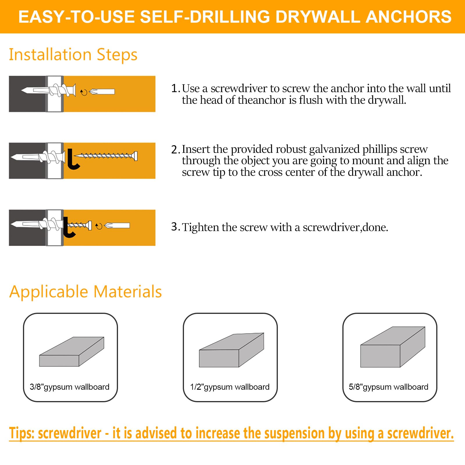 • HEAVY DUTY & WIDE APPLICATION – The self-drilling drywall anchors are recommended for medium-duty applications and are very easy to install. They are perfect for hanging bathroom and kitchen accessories, shelving, light fixtures, mirrors, picture frames, curtain rods and small decorative shelves, and more.