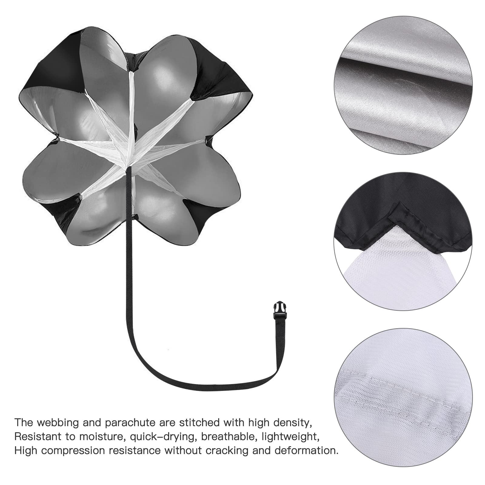 • DURABLE -Made of high quality parachute cloth,Built-in mesh panels keep strings from tangling and helps stabilize the chute during training .