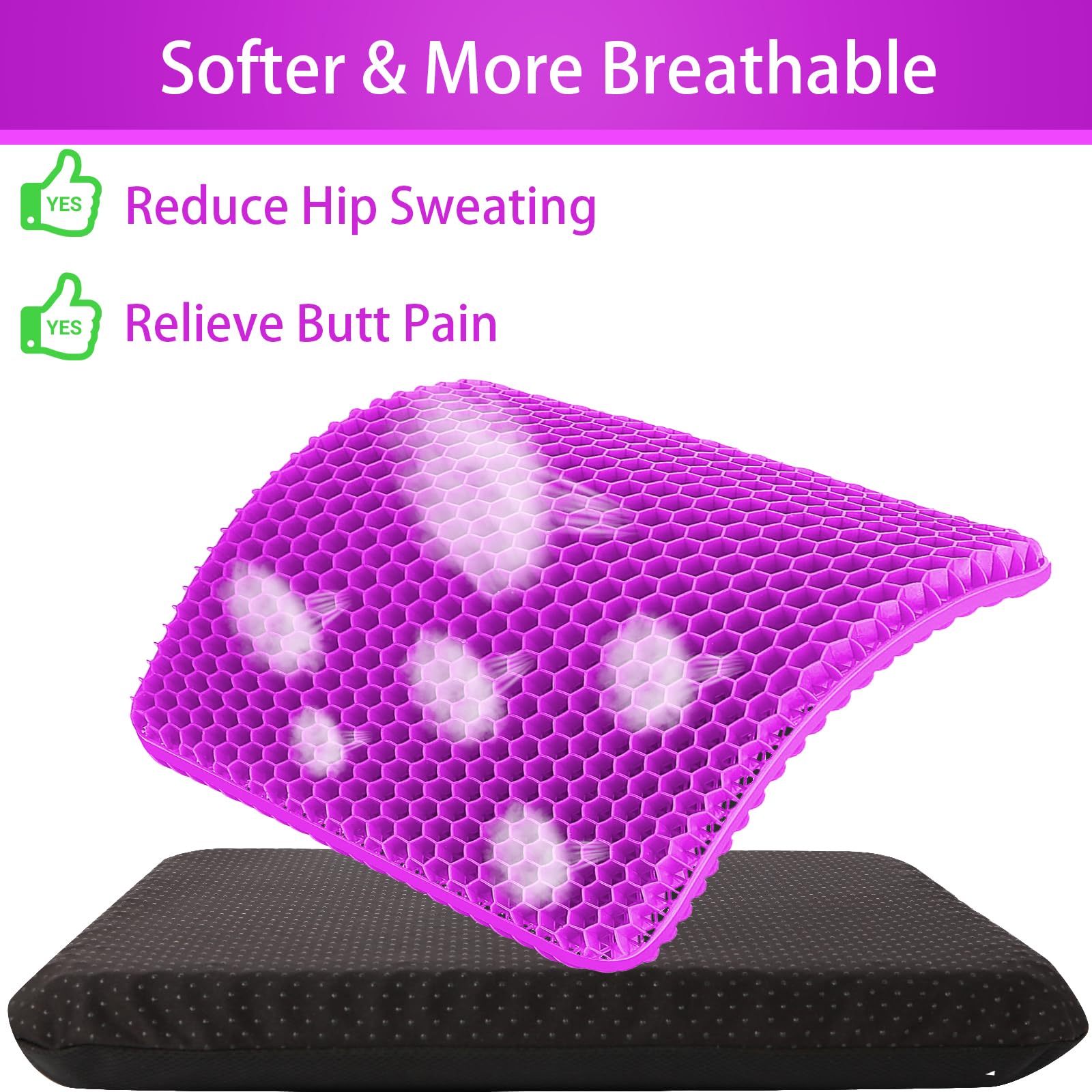 • 【Large & Thick】 This gel seat cushion for long sitting is specially designed large and thick, which is larger and thicker than most other gel cushions. 18.51" × 17.33" × 1.51", which can better match with your chair.(Due to the shrinkable elasticity of the cover, there will be a slight deviation in the measurement size when wearing the cover)
