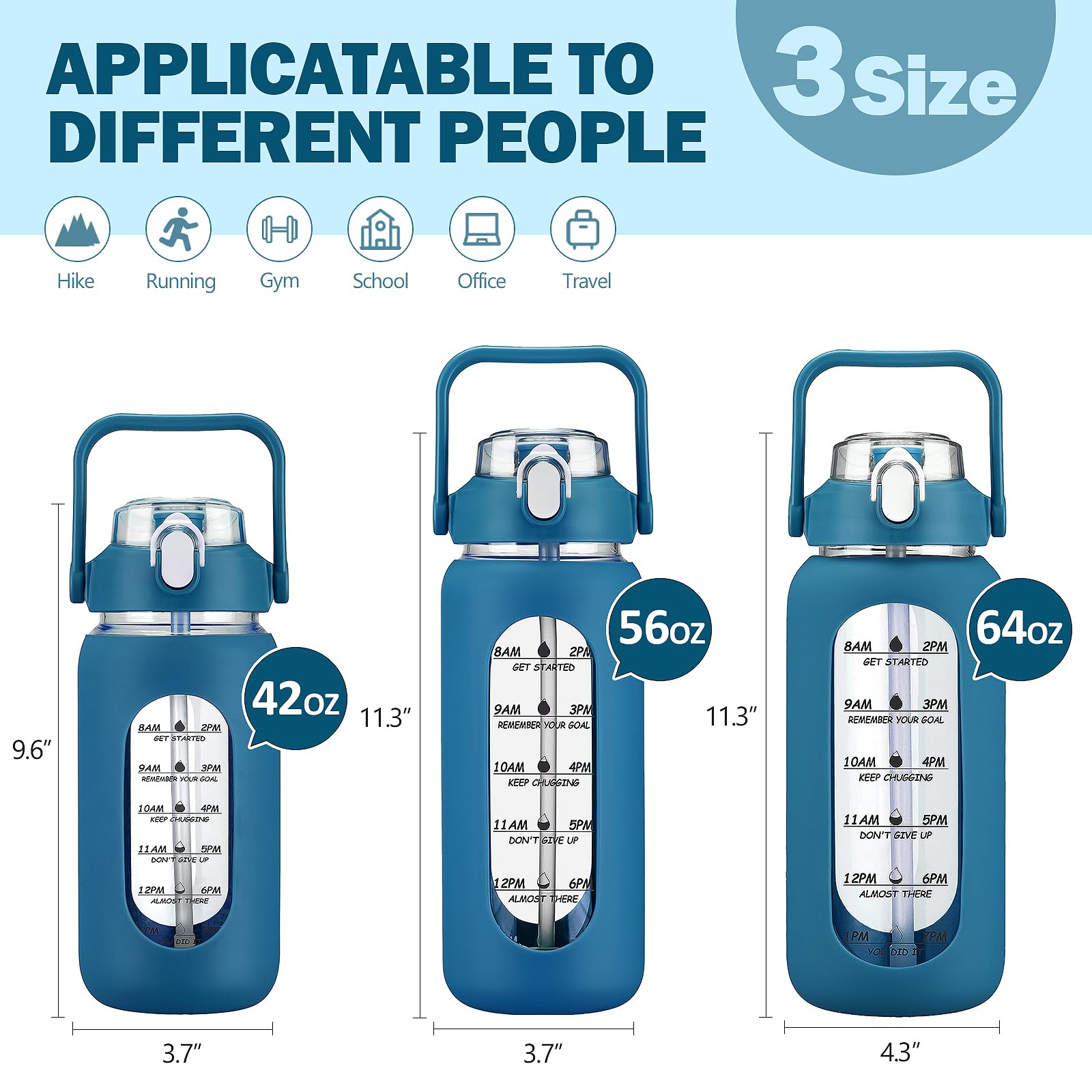 kytffu 56oz Glass Water Bottles with Straw, Motivational Glass Bottle with Silicone Sleeve and Time Marker, Leakproof Large Glass Water Jug for Gym Home Office,Iron Blue