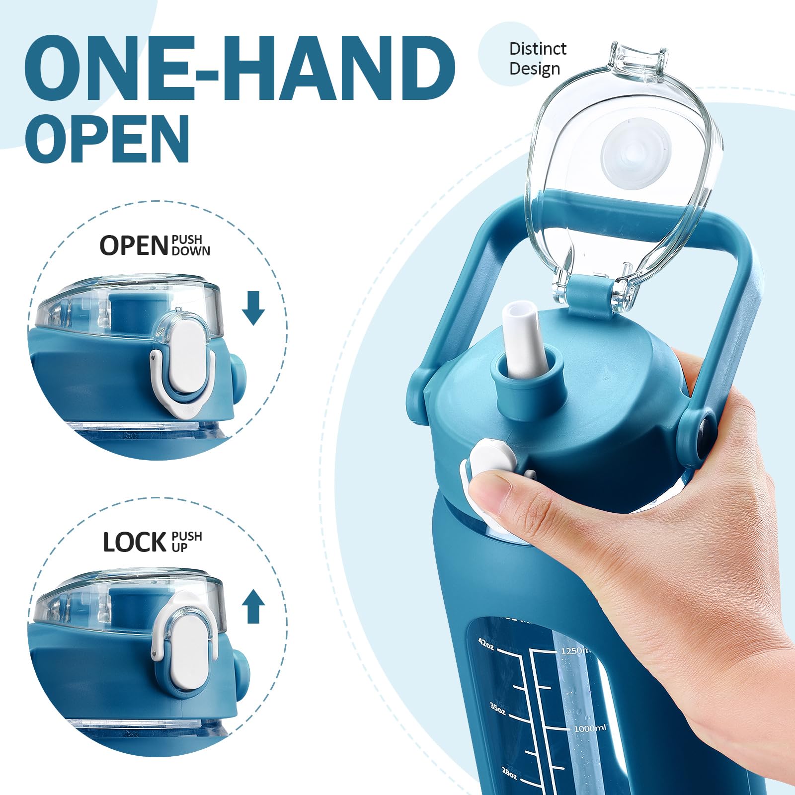 • ❤Glass Water Bottle with Pop-up Straw Lid- Kytffu large 56oz water bottle with straw is designed with an upgraded lid that ensures 100% leakproof and dustproof. Advanced one-click button makes you drink easier, just push the button and the straw will pop out automatically.