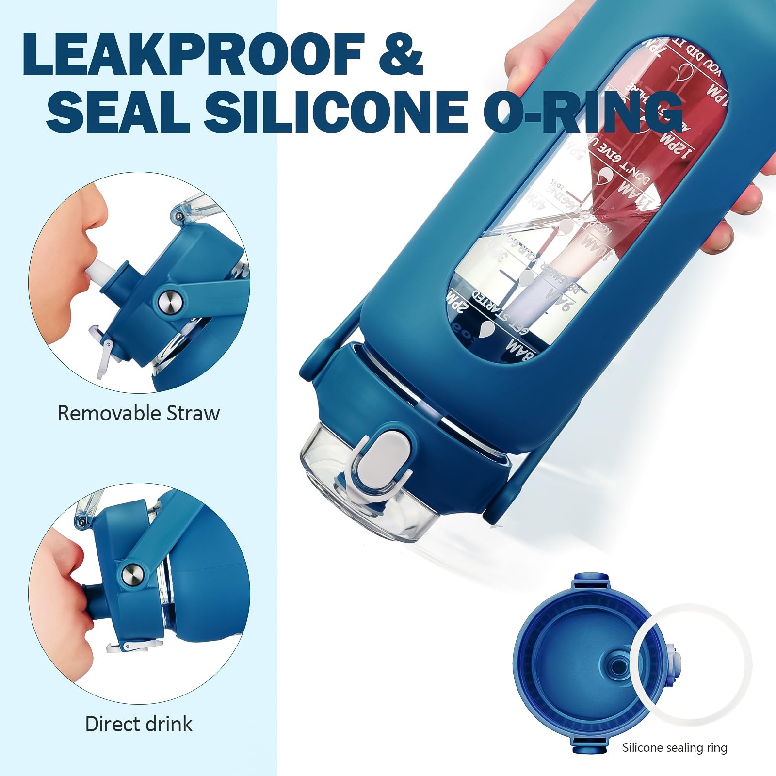 • ❤High-Quality Borosilicate Glass Bottle- This large motivationla water bottle is made of odorless, quality, borosilicate glass. Straw and lid are made of food-grade PP, BPA-free and eco-friendly.