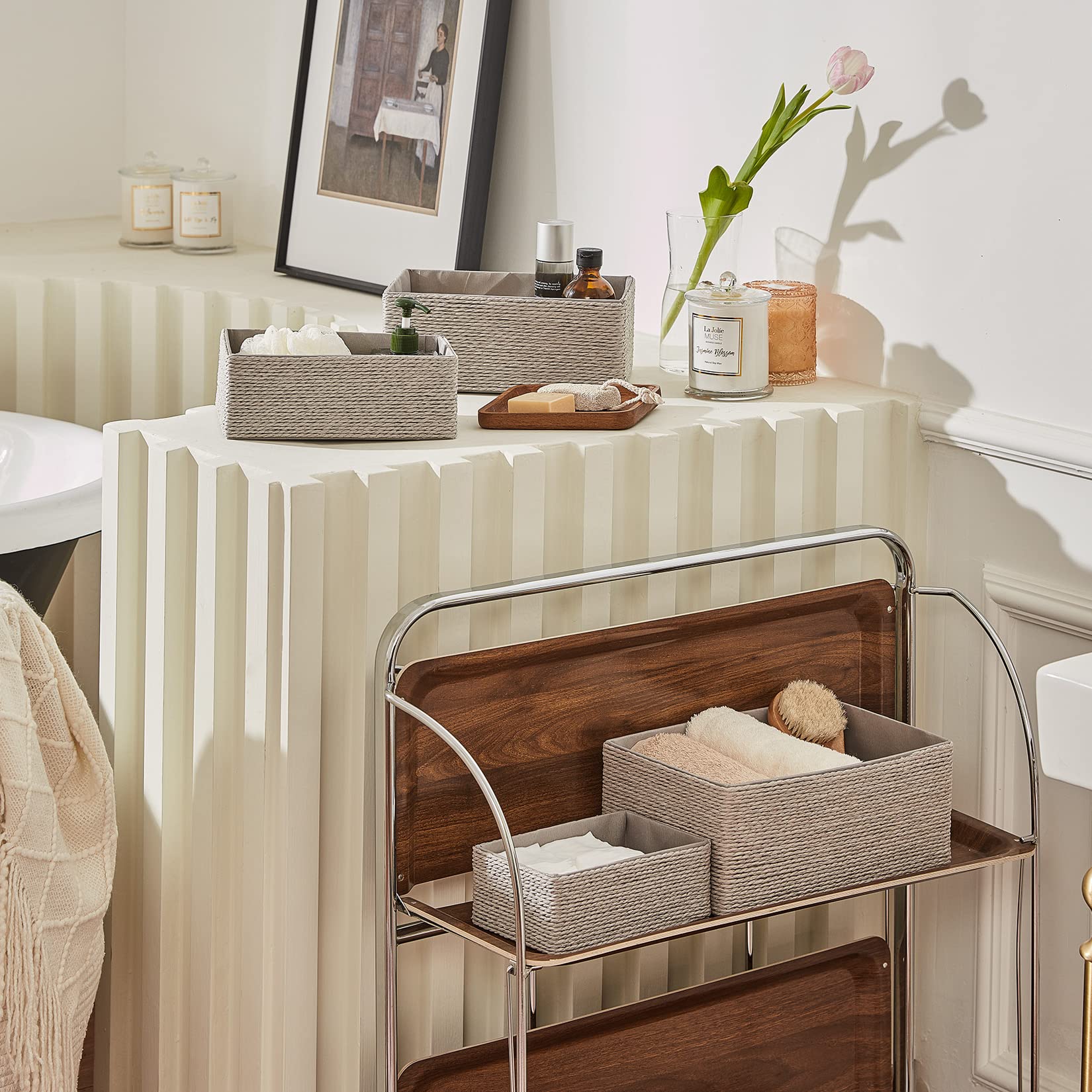 LA JOLIE MUSE Storage Baskets Set 4 - Stackable Woven Basket Paper Rope Bin, Storage Boxes for Makeup Closet Bathroom Bedroom (Gray)
