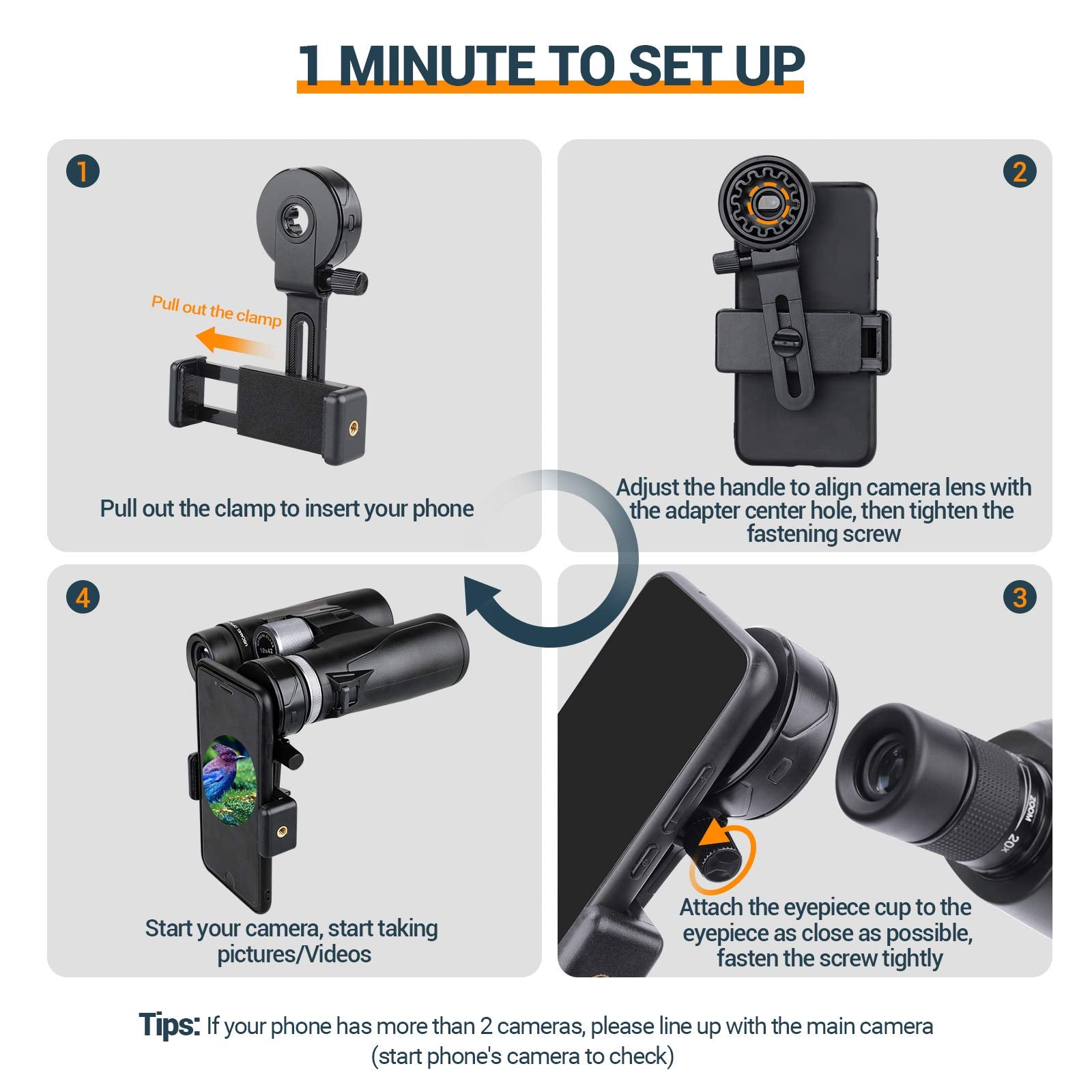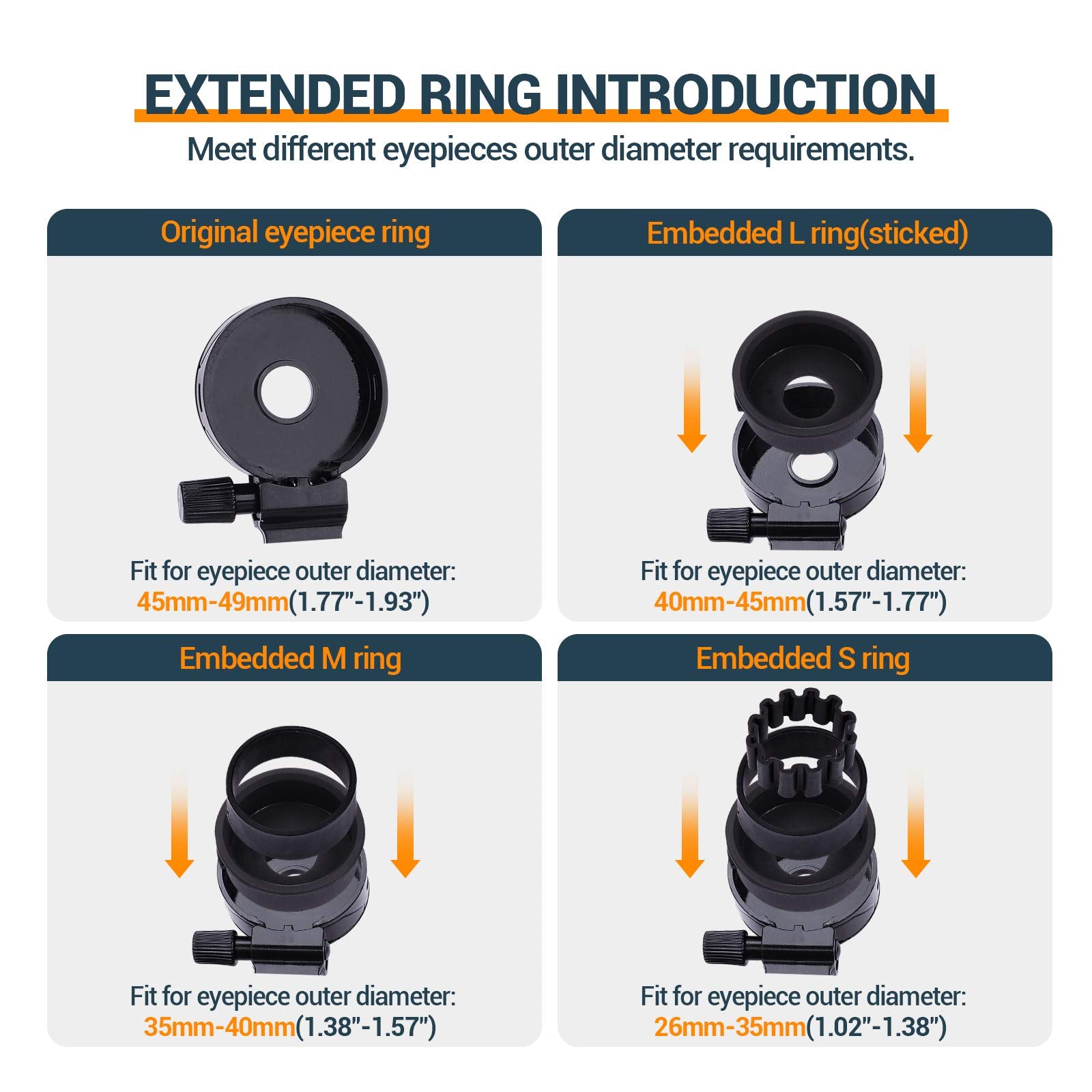 • 【Fits Wide Range of Eyepieces】The universal phone adapter mount(with 3 additional rubber rings) is suitable for eyepieces with 28mm-49mm(1.10”-1.93”) outer diameter and can be mounted almost of binoculars, monocular, telescopes, spotting scopes, Microscopes.
