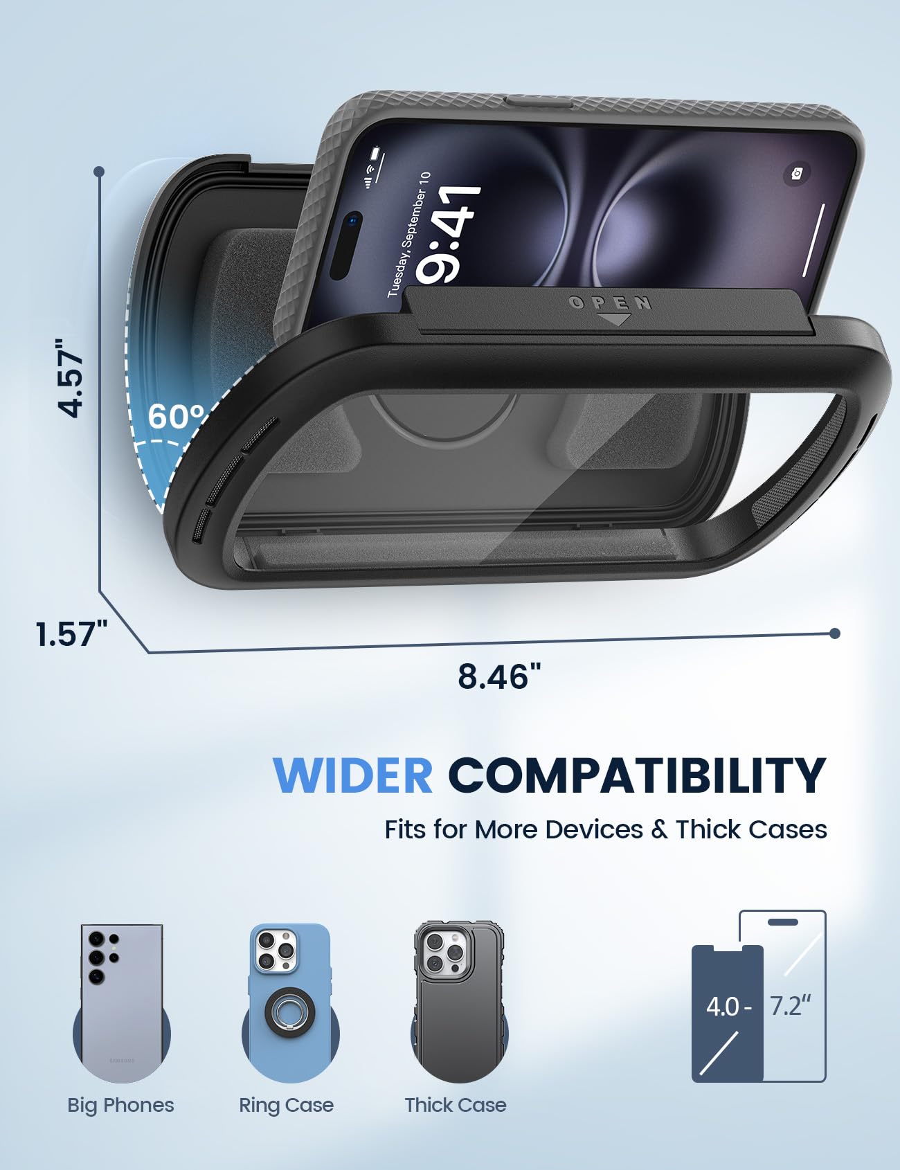 • 【Big Phone? No Problem!】Size: 8.46' x 1.57' x 4.57'. With extra-wide sponge padding, this shower accessories waterproof phone box holder is friendly for 4'-7' Phones and holds up to 1.5cm thickness. Easily fit for iPhone 16 Pro Max, iPhone 16 Pro, iPhone 16 Plus, iPhone 16, for Samsung S25 Ultra, S25+, S25 and more other devices. (NOTE: This shower phone holder can fit for up to 7.2' phones, so it will leave some space using with the small phones)