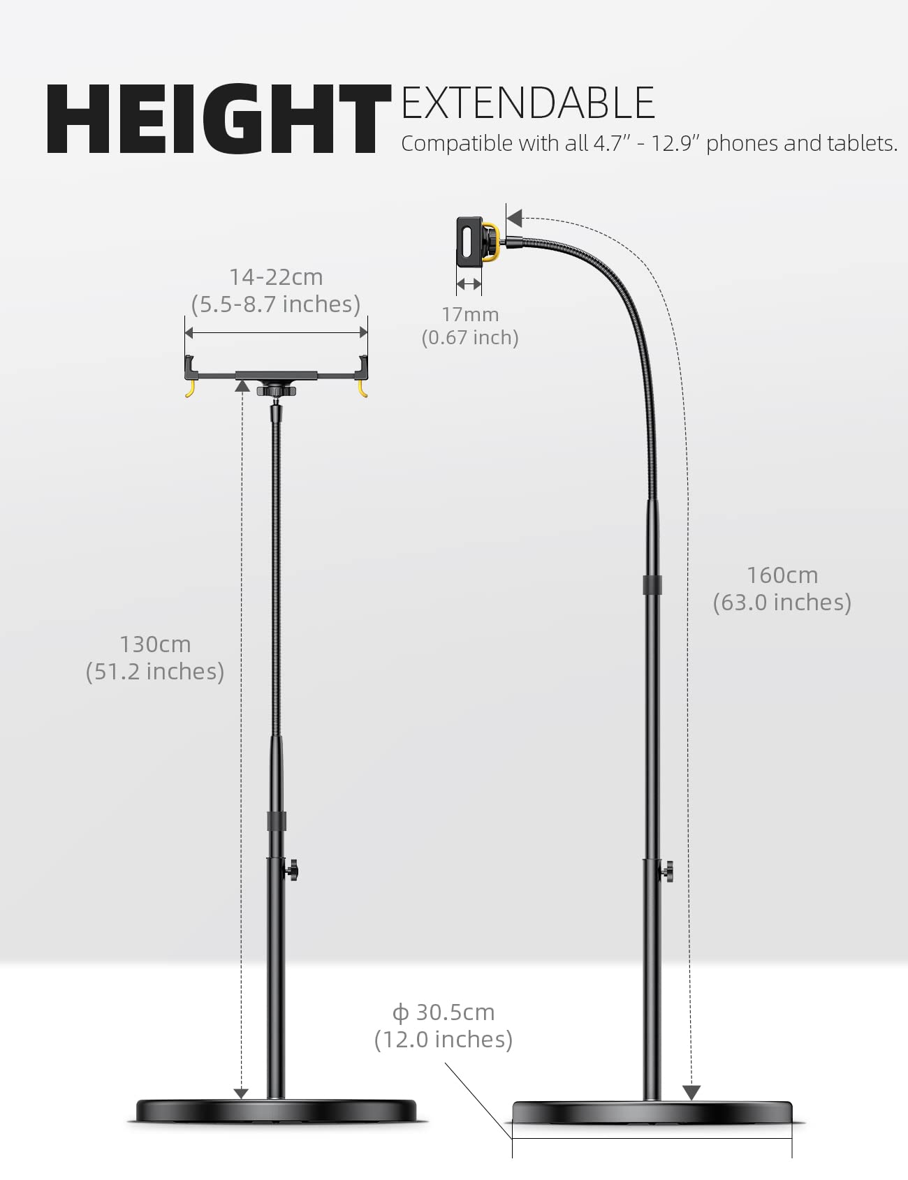 • 【Widely Compatibility】Upgrade clamp part of this tablet floor holder stand make it fits devices from 4.7 to 12.9 inches, including new 2024 / 2022 / 2021 iPad Pro 11/ 12.9 inch, iPad 10.9, iPad Air 6 / 5, iPad Mini 6/ 5/ 4/ 3, iPad Pro 9.7/ 10.5, 2020 iPad Pro, iPad 5th/ 6th/ 7th/ 8th/ 9th/ 10th generation, Kindle scribe Fire HD 7 8 10, E-reader, Huawei, iPhone 17 Pro Max, iPhone 17 Air, iPhone 16 Pro Max, iPhone 15 Pro Max, iPhone 14 Pro Max, 13 Pro Max, 12 11 Pro Max, iPhone Xs Max, Surface Pro, Galaxy Tab S8, S7, A8, A7, Switch, Pixel, Nexus.