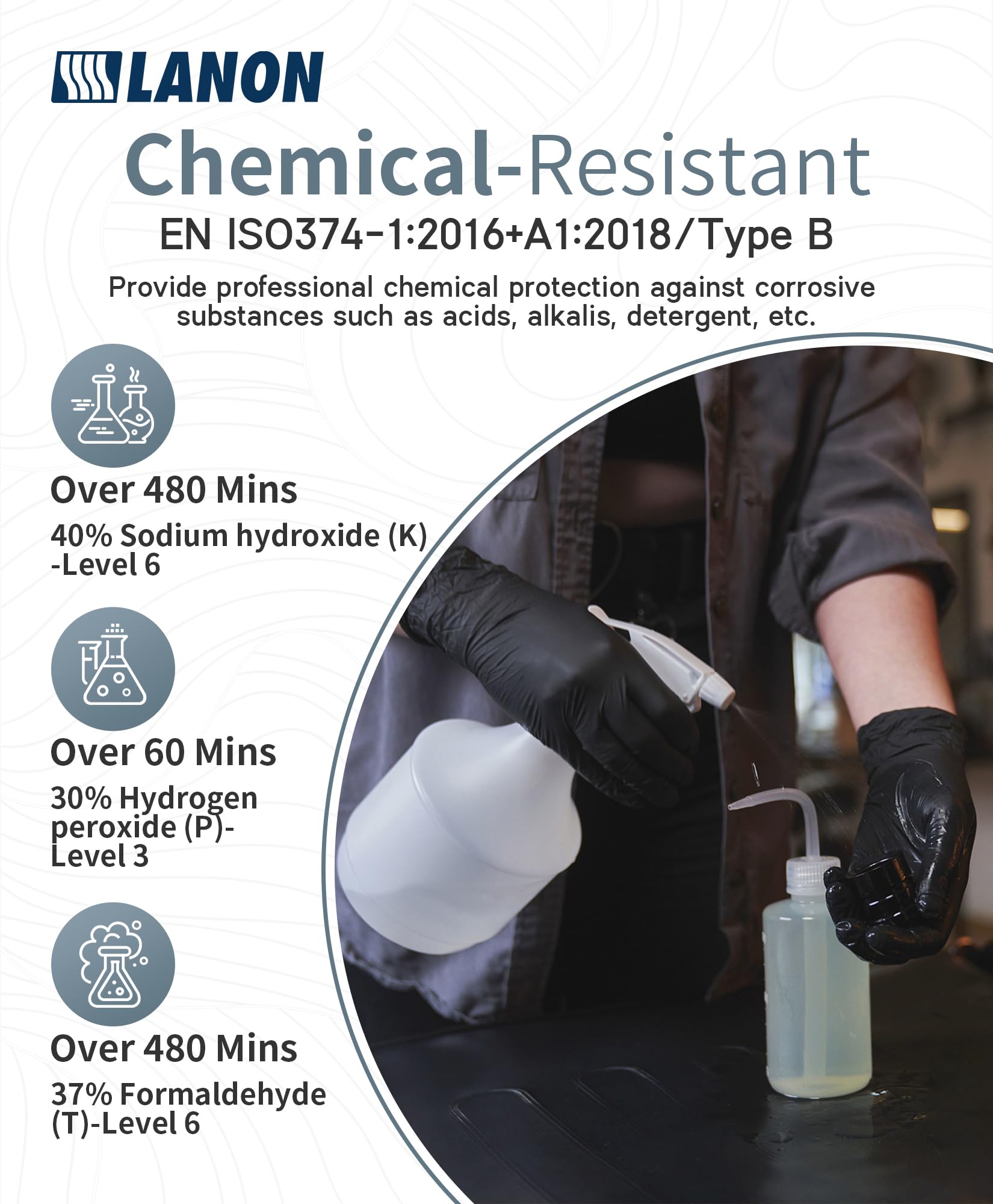 • 【Next-Level Performance】EU Certificated, CAT III, with Standards EN ISO 374-1:2016+A1:2018 / Type B, EN 374-4:2013, EN ISO 374-5:2016. The three EN ISO 374 test chemicals: K-Level 6, over 480 min; P-Level 3, over 60 min; and T-Level 6, over 480 min. The rolled cuff is easy to wear and remove, prevent tearing during donning.