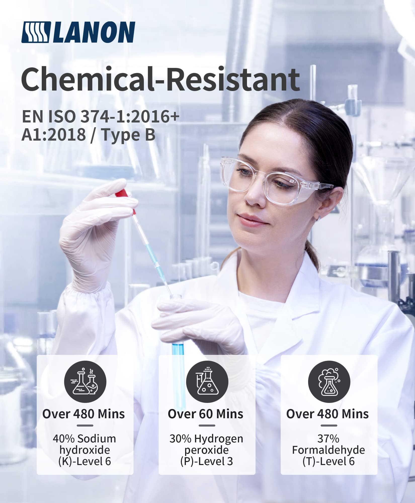 • Next-Level Performance - EU Certificated, CAT III, with Standards EN ISO 374-1:2016+A1:2018 / Type B, EN 374-4:2013, EN ISO 374-5:2016. The three EN ISO 374 test chemicals: K-Level 6, over 480 min; P-Level 3, over 60 min; and T-Level 6, over 480 min. The rolled cuff is easy to wear and remove, prevent tearing during donning.