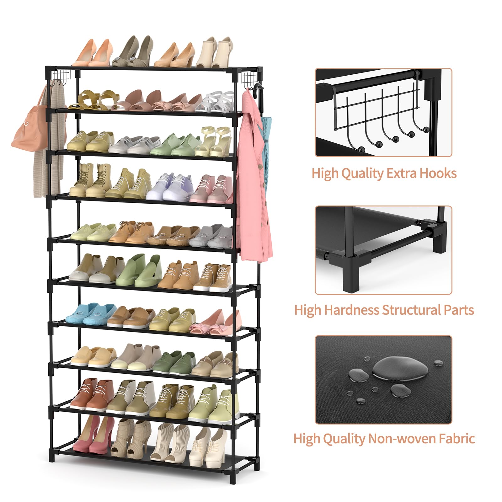 • 【Large Capacity 10 Tier Wide Shoe Rack】The 10 tier shoe organizer can store up to 50 pairs of adult shoes, and you can remove one layer to fit long boots. This shoe organizer is not only suitable for shoes, but also for bags, toys, towels, sundries, books, plants and small accessories. Shoe storage with 10 hooks, you can hang keys, umbrellas, bags, etc., very practical design.