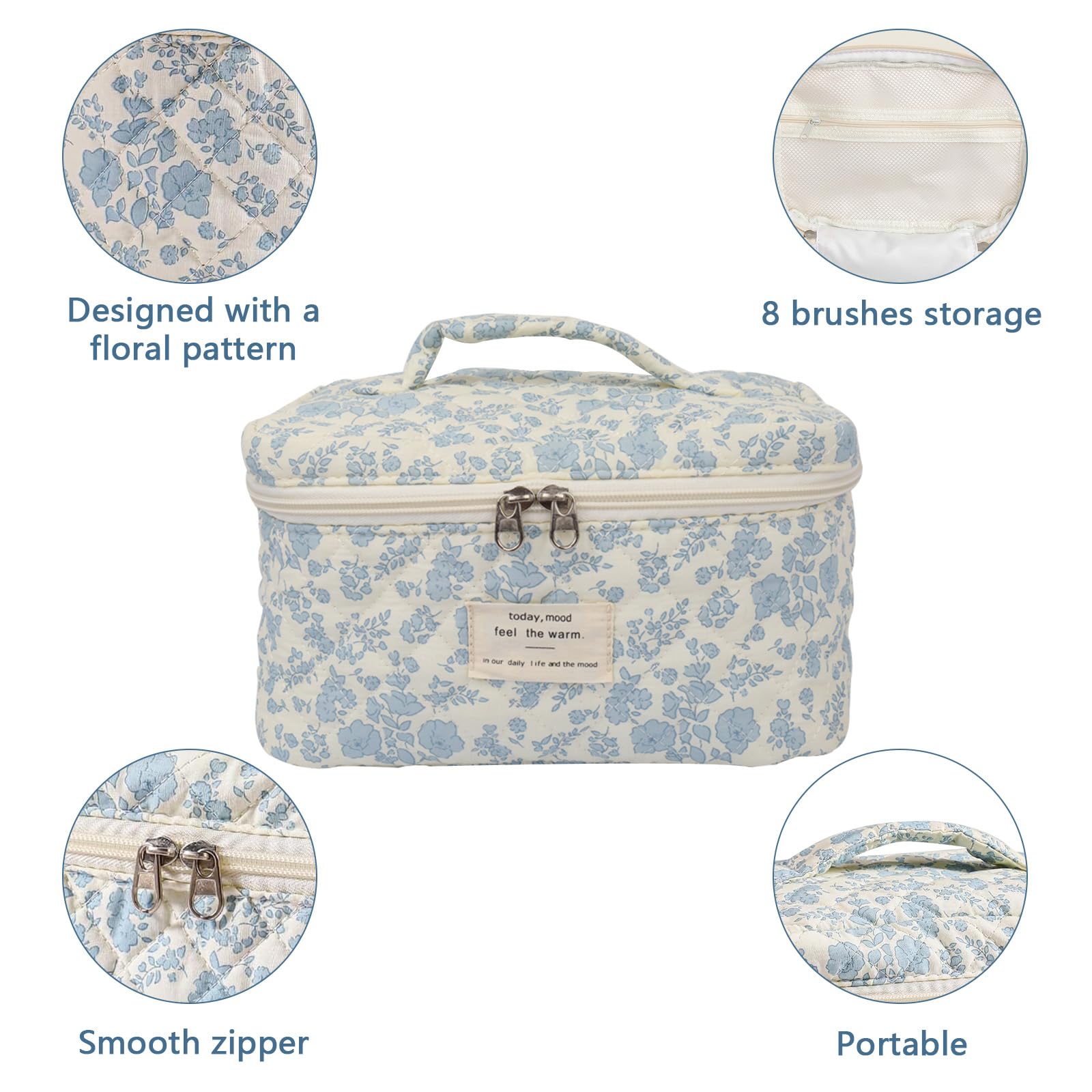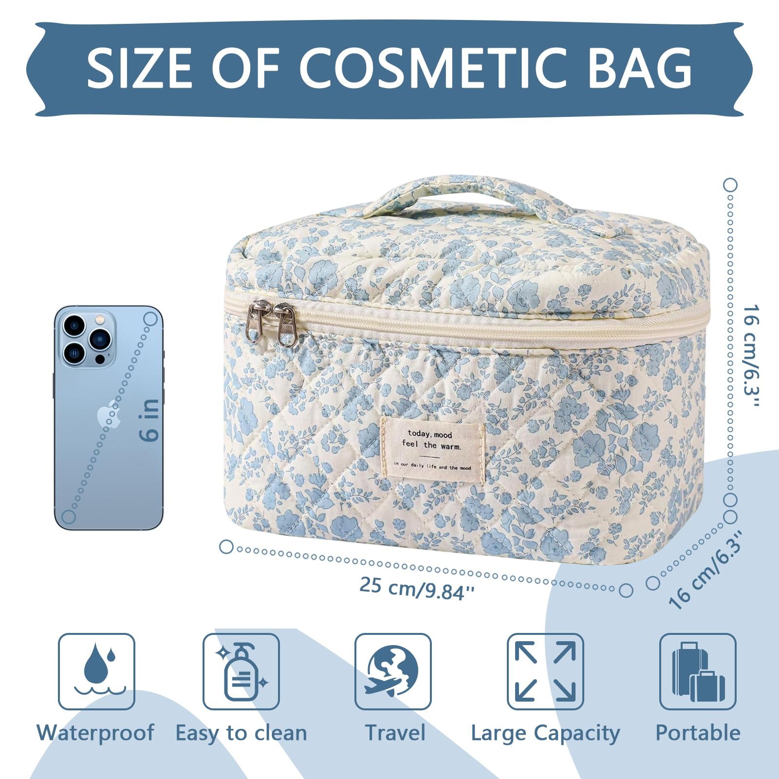 • ✅High-Quality Material: This travel cosmetic bag is made of cotton material, which is easy to clean, has been well- stitched and reinforced at all stress points. The double zipper is made of high-quality gold-plated alloy, which can make the makeup bag easier to pull and align neatly.