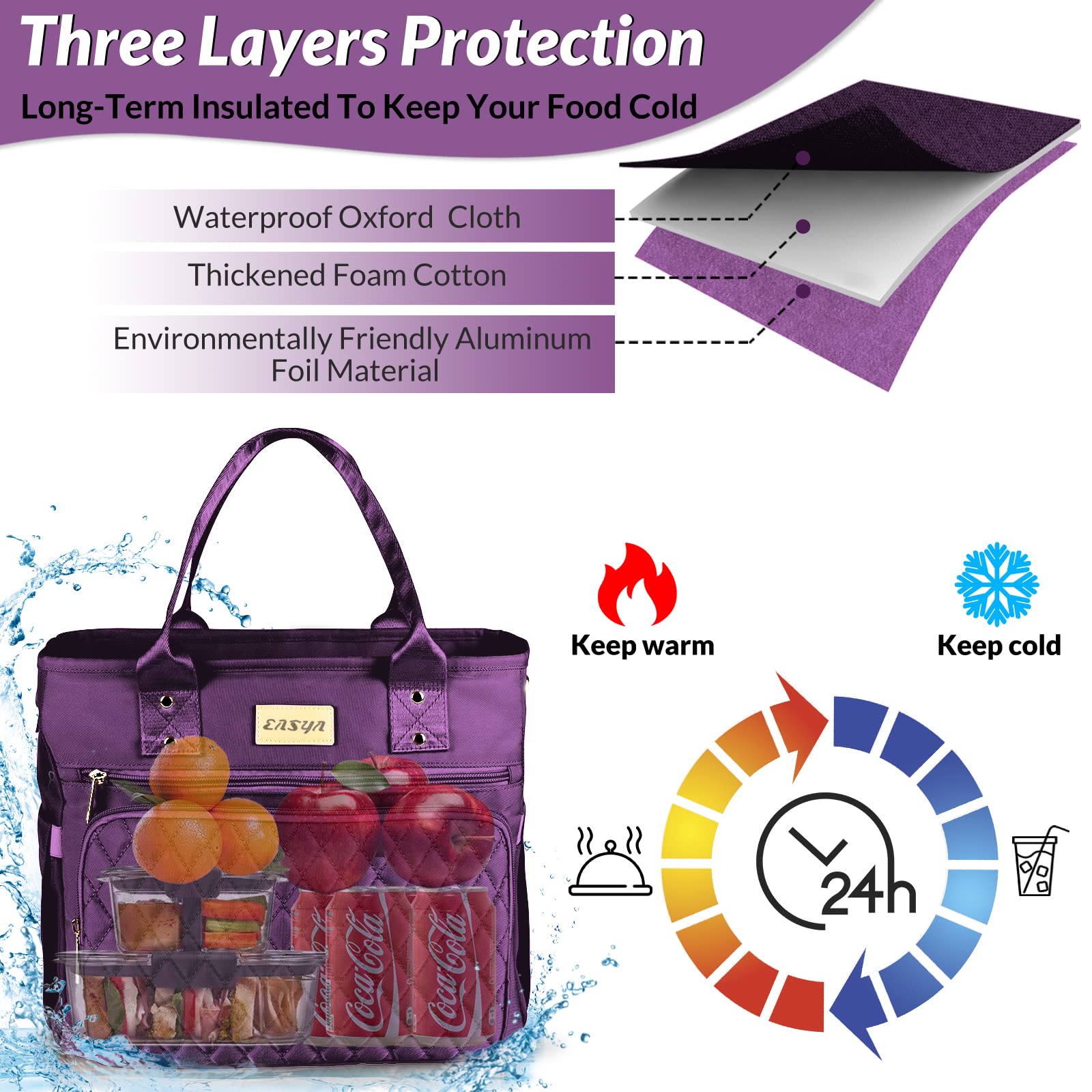 Large Women Lunch tote Bags for Work Insulated/Insulated Adult Lunch Box for Women/Nylon Thermal cooler Bag Leakproof Cooler Tote Bag with Storage Pocket (lumina purple)