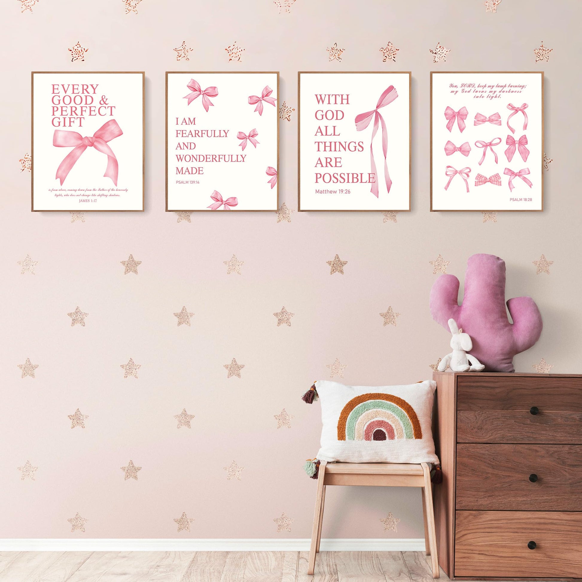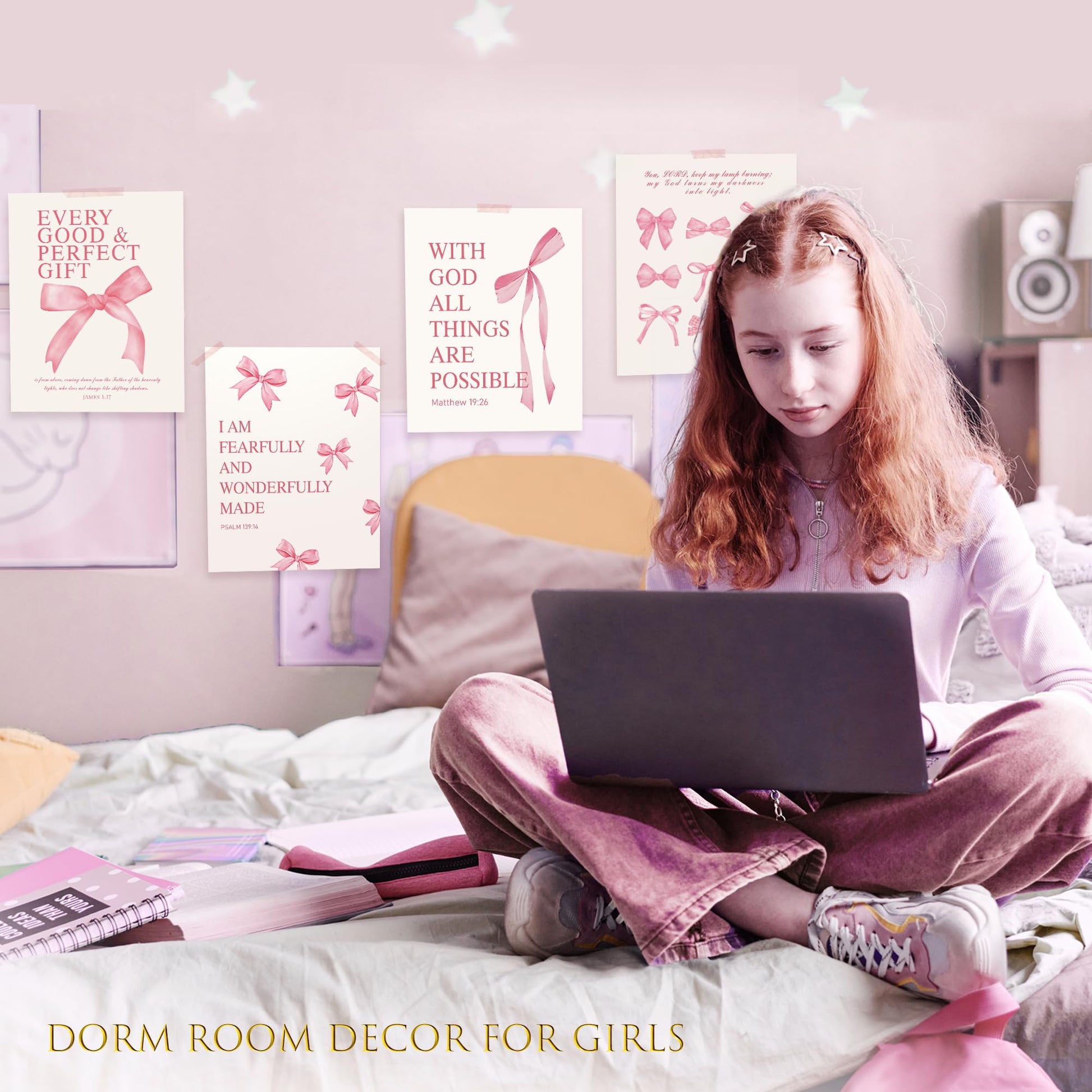 LARTSFRO Coquette Pink Bow Wall Art Decor Posters, Pink Bow Christian Room Bedroom Bathroom Dorm Wall Art Decor Aesthetic for College Teen Girls Gifts, Inspirational Bible Verses Bow Wall Decor, 10x8 Inch Set of 4 Pcs Bow Pictures (UNFRAMED)