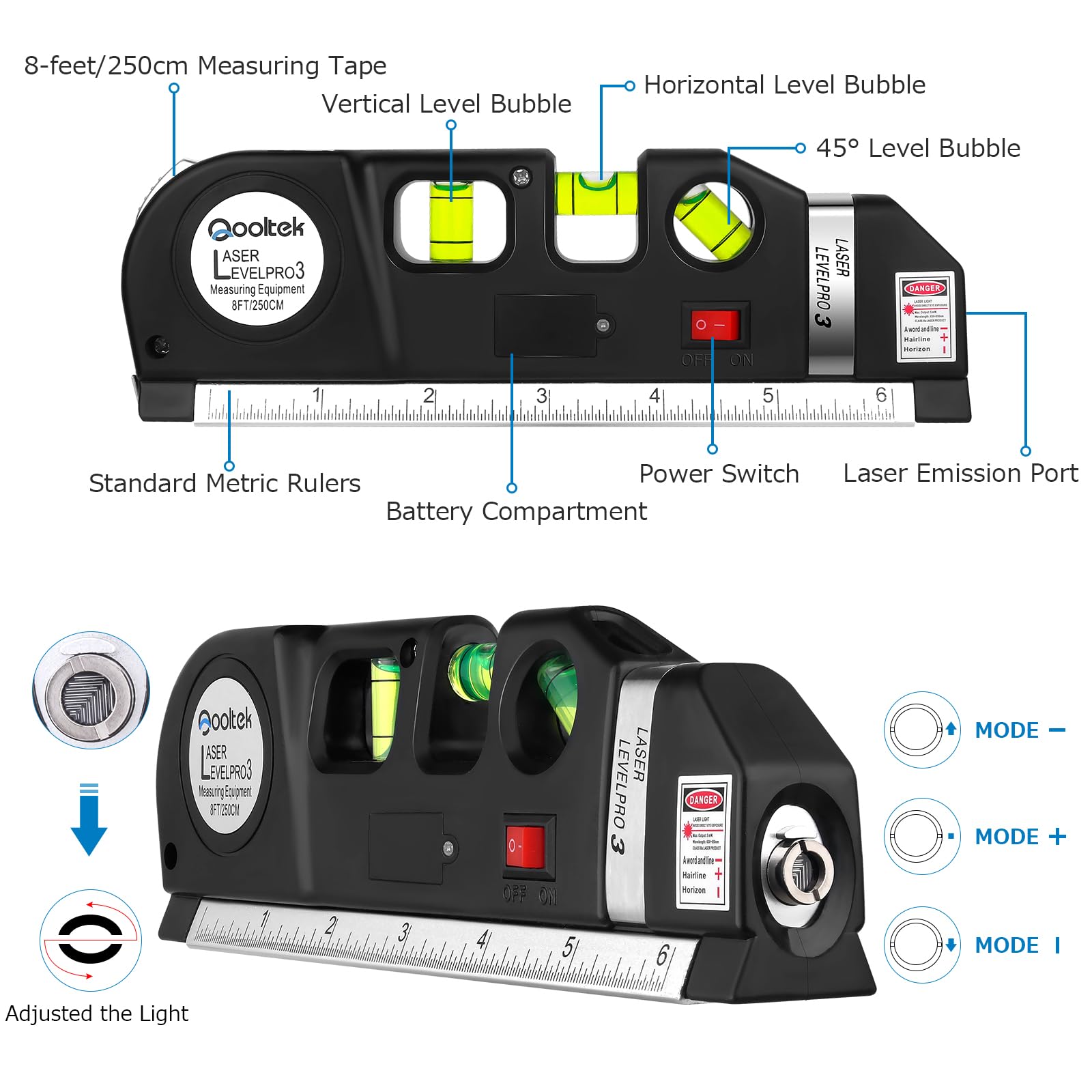 • 【ACCURATE MULTI-FUNCTIONALITY】This laser level tool integrates a 3-pronged approach with a fine-tuned 8-foot measuring tape, triple-positioned leveling bubble (0°, 90°, and 45°), and laser level modes (vertical, horizontal, and cross). It ensures accurate results for projects like hanging shelves, aligning frames, and leveling curtains or wallpaper. The precision is enhanced with graduations down to 1/32” and 1mm, making it a reliable tool for detailed measurements.