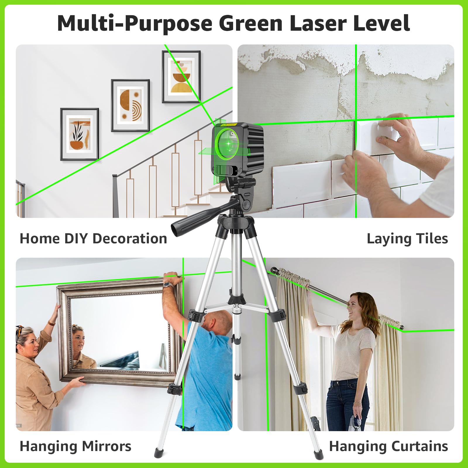 • 【100Ft Laser Leveler DIY Tool】Huepar B011G 100ft DIY self-leveling lazer leveller With advanced Germany green diode technology, they are brighter, more precise and last longer than other line lasers. The leveler tool will projects a 110° horizontal line and a 110° vertical line with an accuracy of 1/9 Inch at 33 Feet when working. Huepar cross line laser level is a good tool for home DIY such as installing photo, door, window, or furniture carpentry, hanging wallpaper, etc