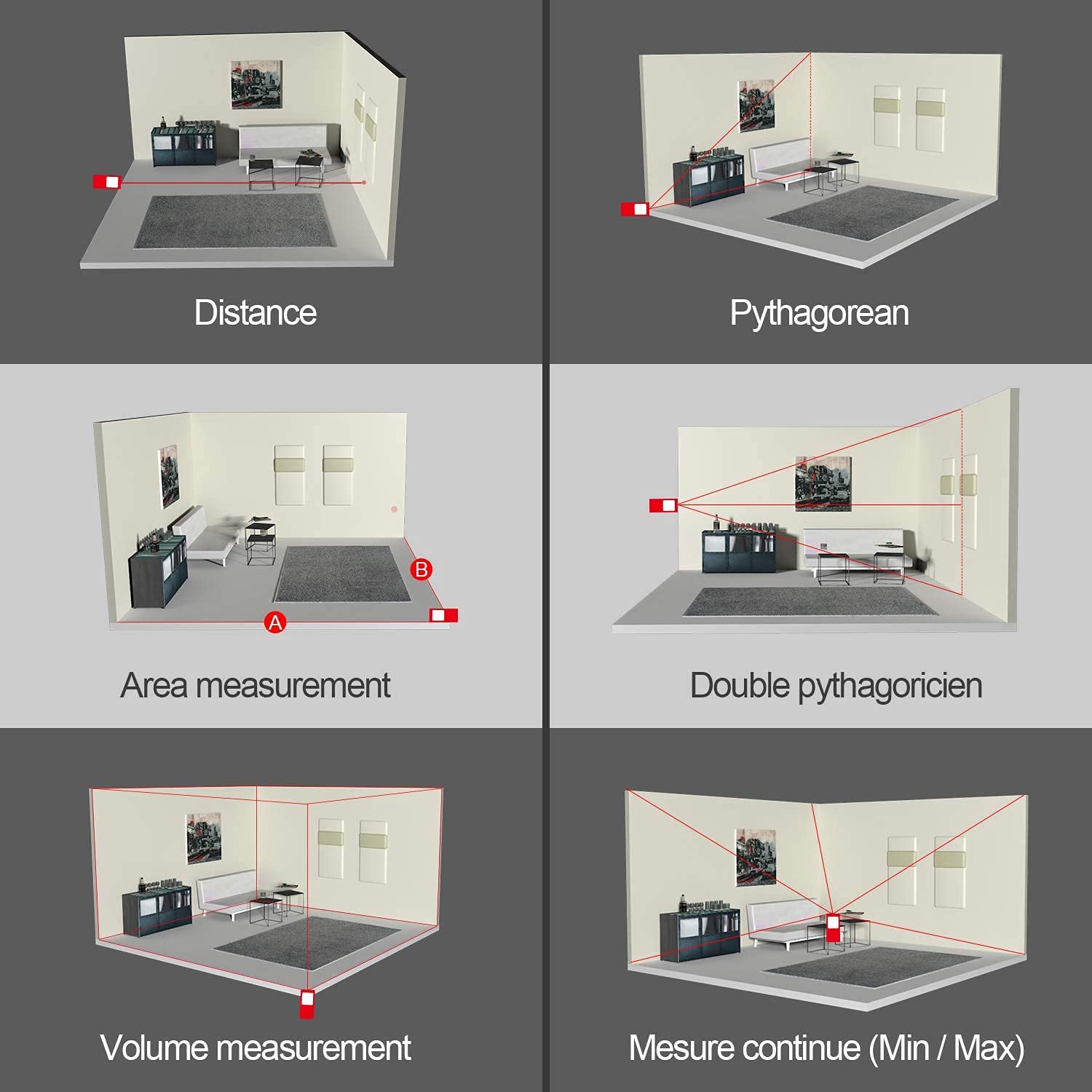 • [UNIQUE FUNCTIONS] The high precision laser head component can be measured quickly and accurately in 0.5s, Auto-Level: Only measure the hypotenuse, the horizontal distance and vertical height will be calculated automatically; Auto-height: Only measure 2 hypotenuses, the vertical height will be calculated automatically; Fast measurement: automatic calculation of area and volume with one button operation
