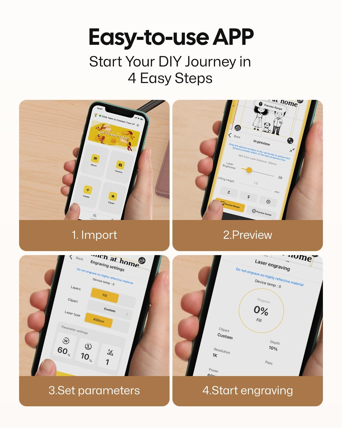 • 3-Step Wood Engraving - No Experience Needed: ① Bluetooth connect ② Set 20cm height ③ Upload designs. Create custom wooden tags/plaques in 4x4" area - 5x faster setup than similar tools.