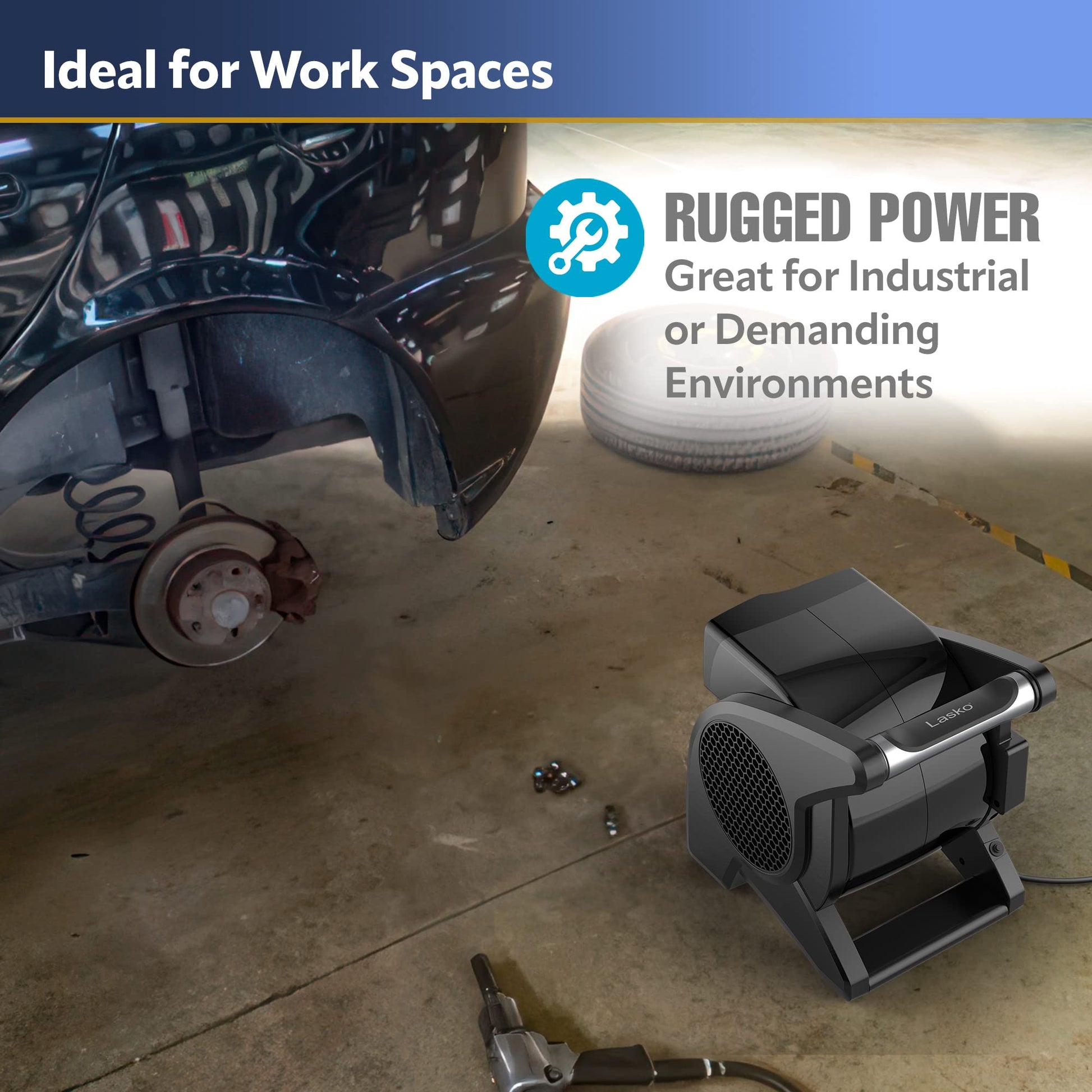 Details: 'The Lasko Professional Utility Fan offers a great cooling solution with its high velocity air stream, ideal for a variety of settings, including as an office fan. With its three fan speeds, it delivers powerful air circulation with a maximum of 375 CFMs. Its rugged construction makes it suitable for job sites and heavy-duty floor fans for spaces like kitchens and garages. With a pivoting action, this air circulator fan allows for directional airflow from floor to ceiling, making it adaptable for any workspace or home environment. Its compact yet powerful design easily fits into tight spaces, functioning effectively as an office fan for desk use. Enhancing its utility, this plug-in desk fan includes two 120-volt accessory outlets, providing even greater functionality for on-site jobs or other demanding tasks. This utility fan's ETL Listing, integrated circuit breaker, and reset button, coupled with a 10-foot power cord and a grounded 3-prong plug provides safe and reliable operation. Its lightweight nature, featuring a large carry handle, providing easy portability. Fully assembled and ready for action, the Lasko fan is a versatile tool to ventilate, cool, and dry spaces efficiently. Whether for professional settings or at home, this utility fan is engineered to meet the demands of heavy-duty use and provides a consistent, cooling breeze