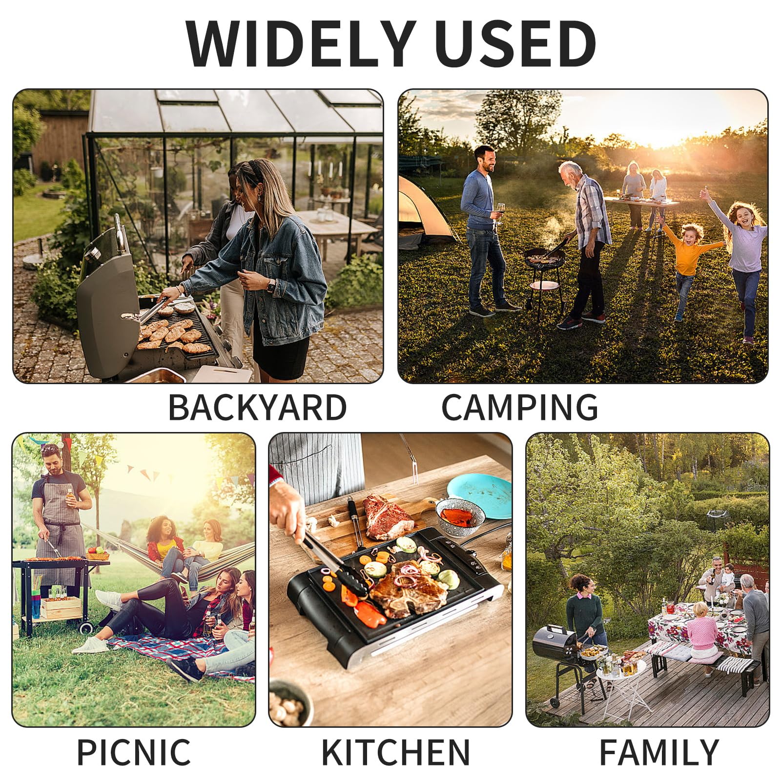 • 【Complete Selection of Grill Tools】Kit includes spatulas, tongs, seasoning bottles, lids, cleaning brushes, etc, to meet the needs of all forms of indoor and outdoor grilling. The long handled spatula makes quick work of tossing large quantities of food, the lid concentrates heat for quick heating and splash-proofing, the meat fork pierces through crispy and juicy meat with ease, the oil and seasoning bottles provide even flavor, and the cleaning brush saves time and effort on cleaning.