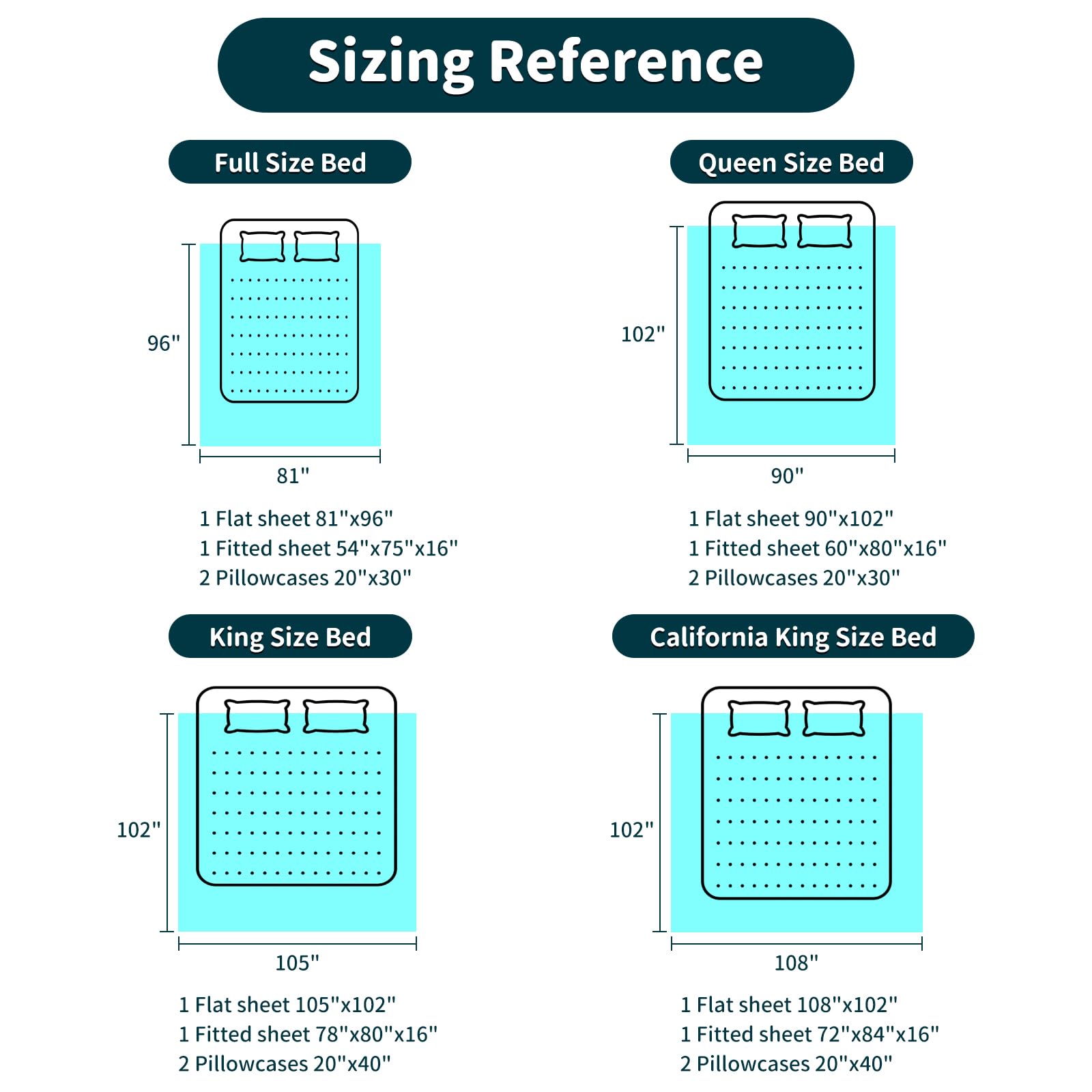 • Queen Sheet Set: our queen sheet set includes 1 flat sheet 90 by 102 inches; 1 fitted sheet 60 by 80 by 16 inches; 2 pillowcases 20 by 30 inches