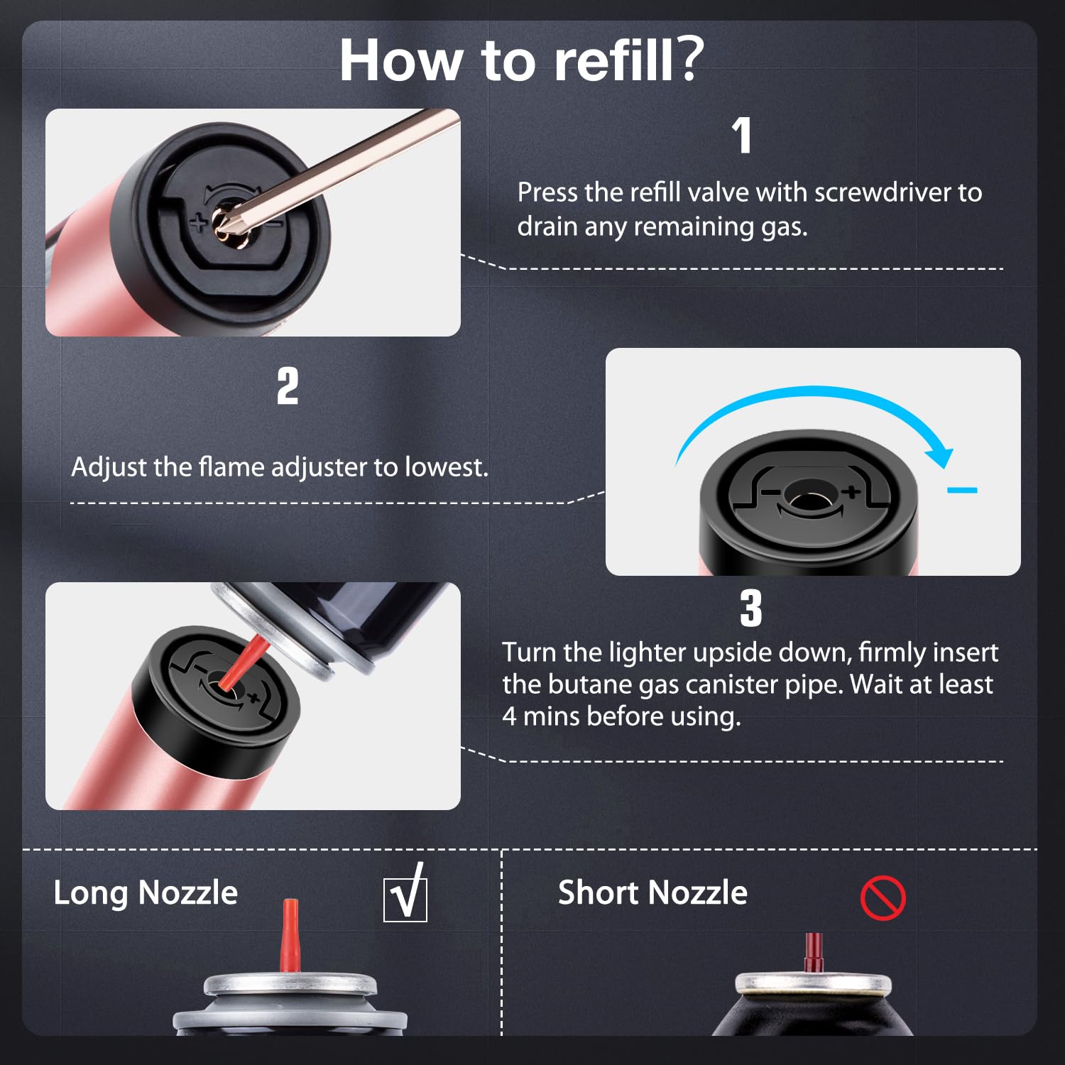 • REFILLABLE AND ADJUSTABLE: No need tools, you can easily adjust the flame height by turning it by fingers. Compared with disposable lighters, the torch lighters can be refilled and used repeatedly, which is more friendly to our earth