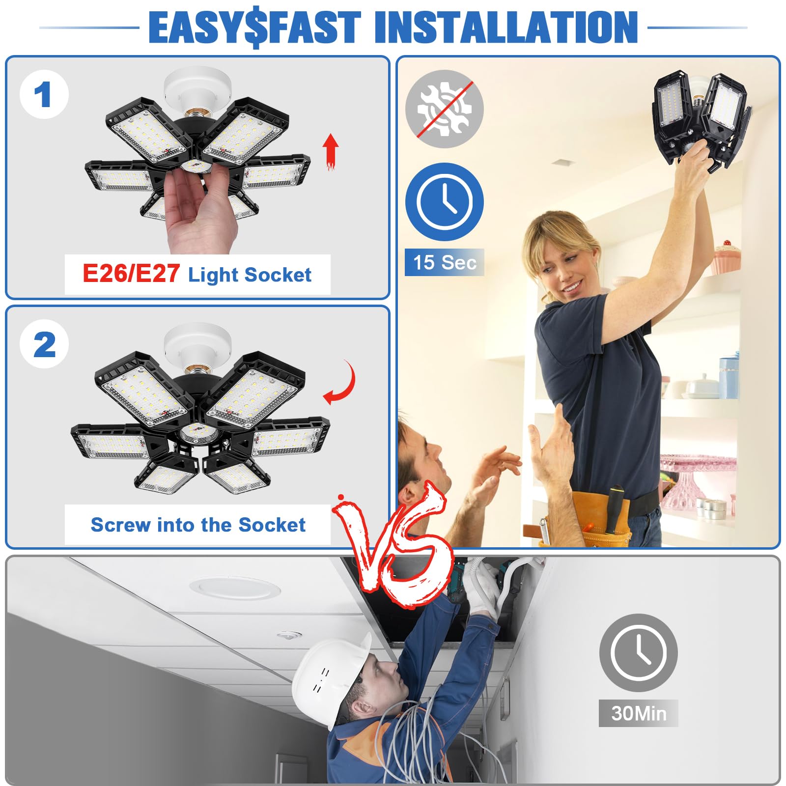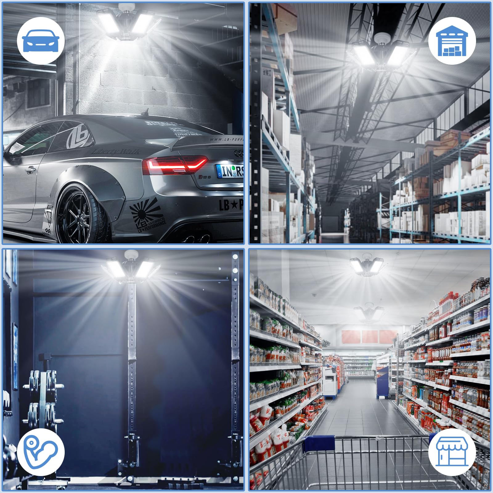 • 【6+1 Newest Garage Lights】With 6+1 deformable panels, the best led garage ceiling lights can be adjustable from 0 to 90 degree, which illuminate each corner of your garage in 360 full coverage without visual blind spots and dizziness. The workshop lights will provide better light than 3, 4 and 5 panel garage lights ceiling led on the market.