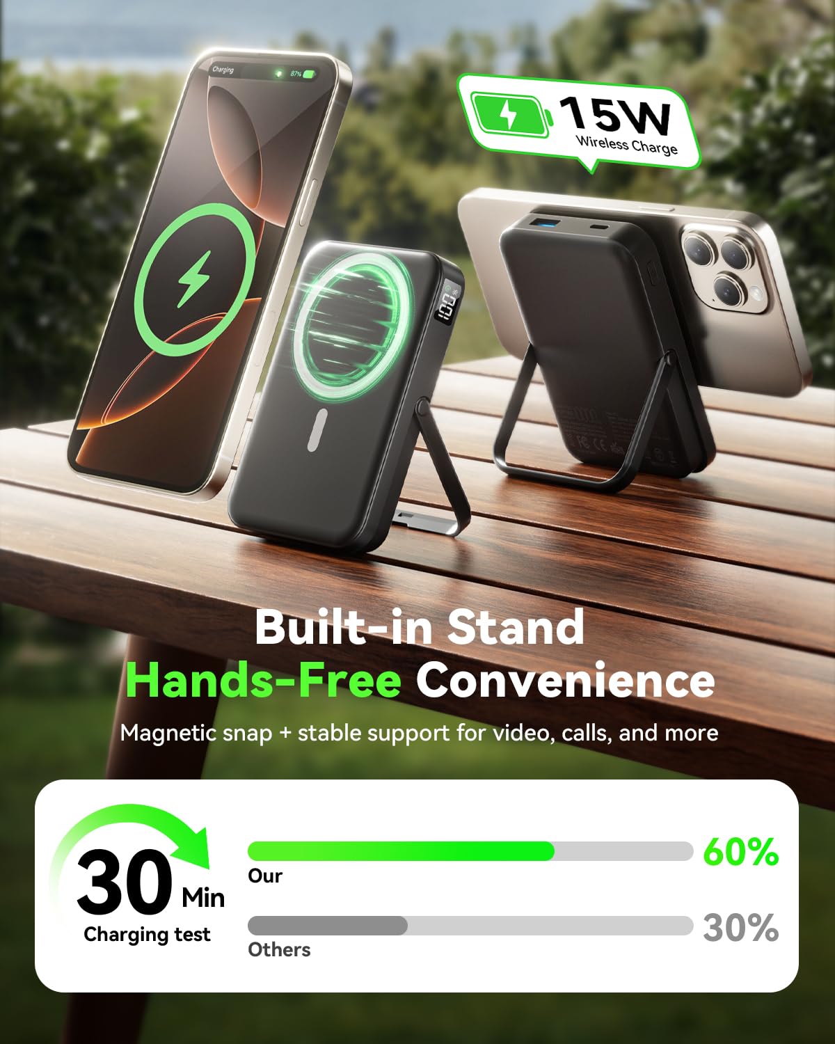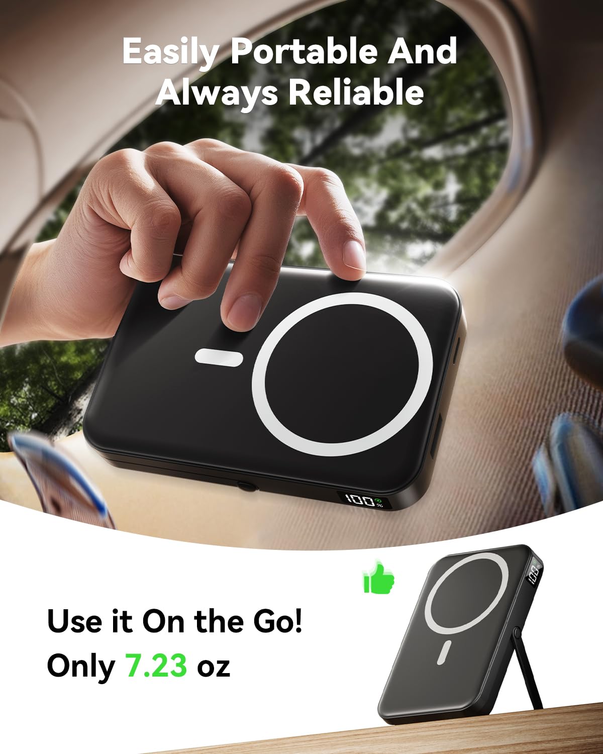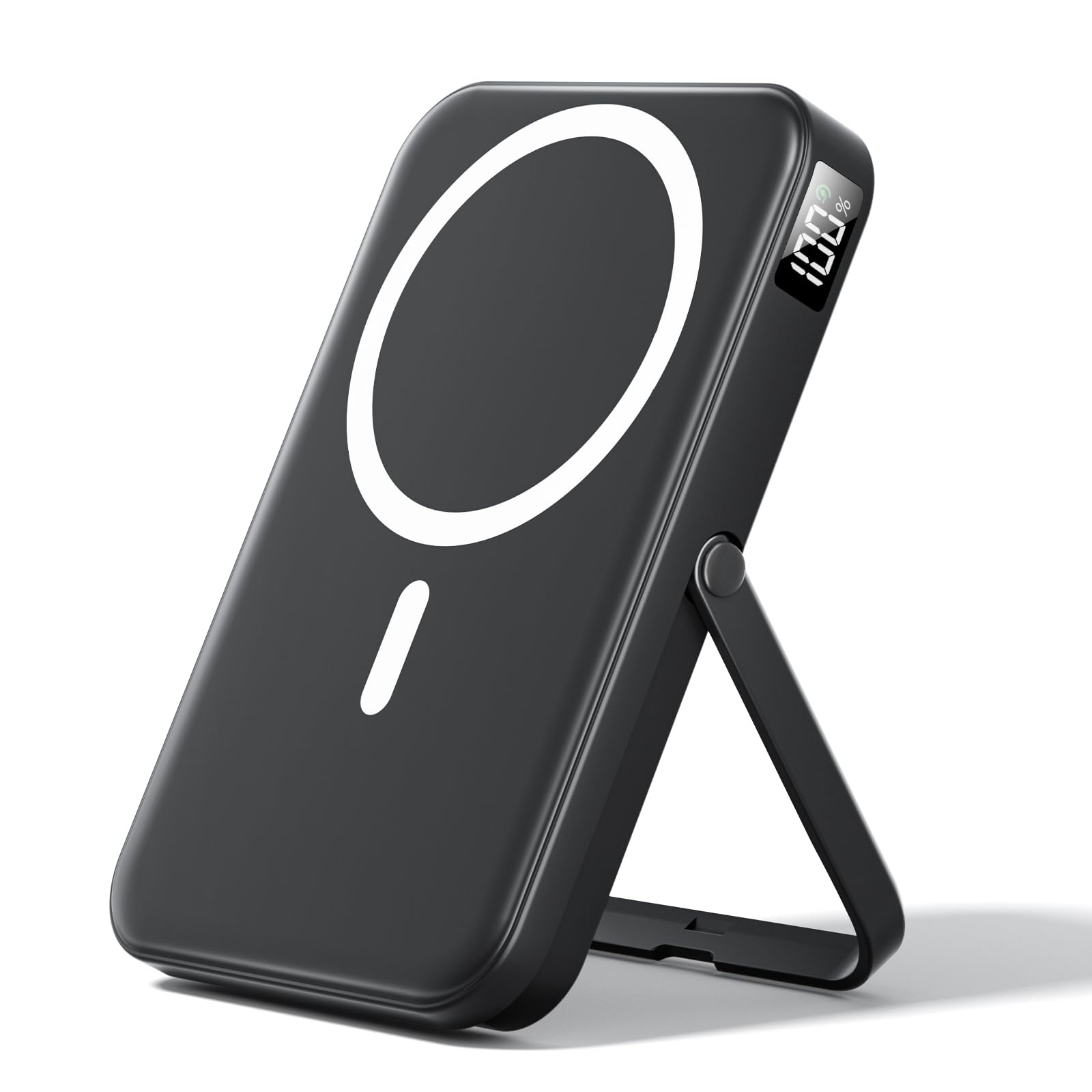 • 【Foldable Stand for Hands-Free Use】Equipped with a sturdy foldable stand,this wireless charger for MagSafe iPhone easily transforms your device into a mini workstation or entertainment screen while charging.Use it vertically for FaceTime or horizontally for Netflix.More than just a power bank,it’s a practical portable charger that adds convenience to work,travel,or daily use.