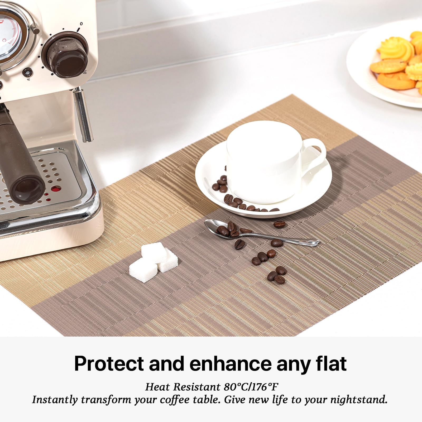 • HEAVY-DUTY:We uses the German-imported higher grammage vinyl material (Specialty PVC)than other placemats on the market,plus the precise,dense weave craftsmanship to give the woven placemats a thicker feel and make the place mats long-lasting.