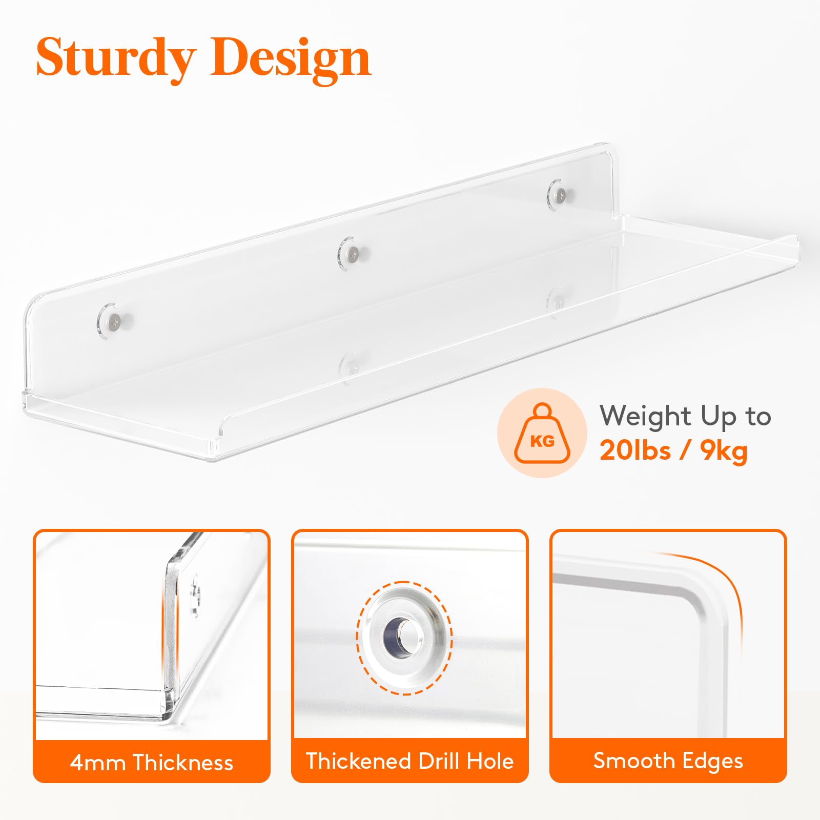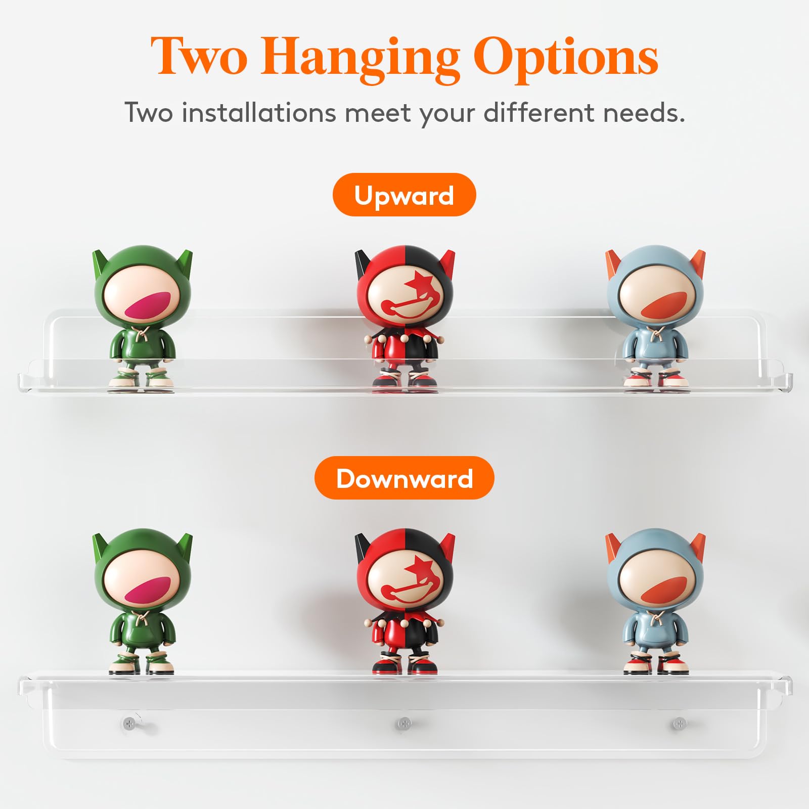 • 2 Ways to Install: The two hanging options are upward or downward. Acrylic shelves come with pre-drilled holes, detailed instructions, and all necessary mounting hardware, including screws, wall anchors, and bubble lever, which make installation simple and easy in just a few minutes.