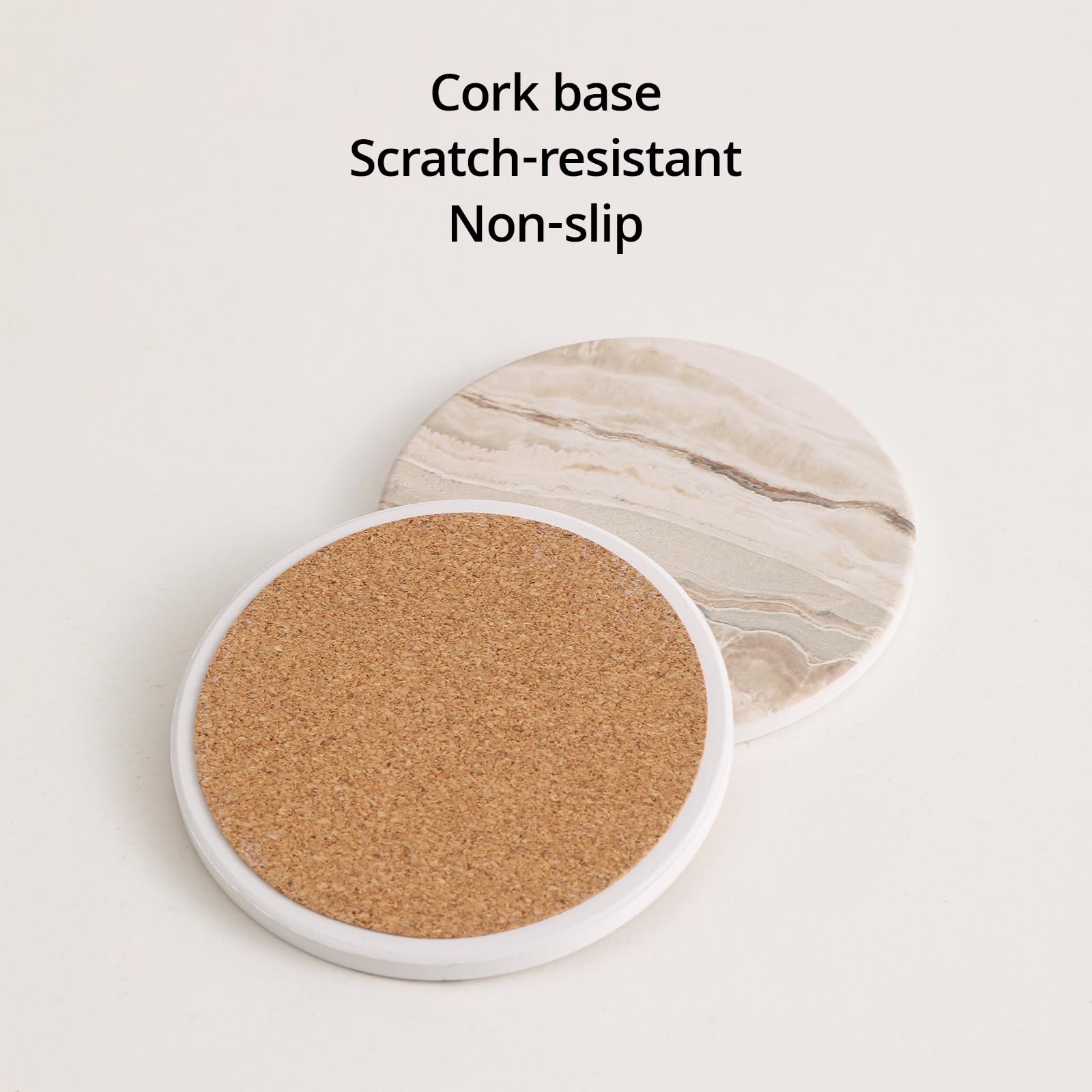 • Non-Slip: Stone coasters equipped with a cork backing to prevent slipping, it stays securely in place on any table. Unlike silicone, fabric, or other materials, the ceramic surface holds cups steady, ensuring stability for different types of drinks