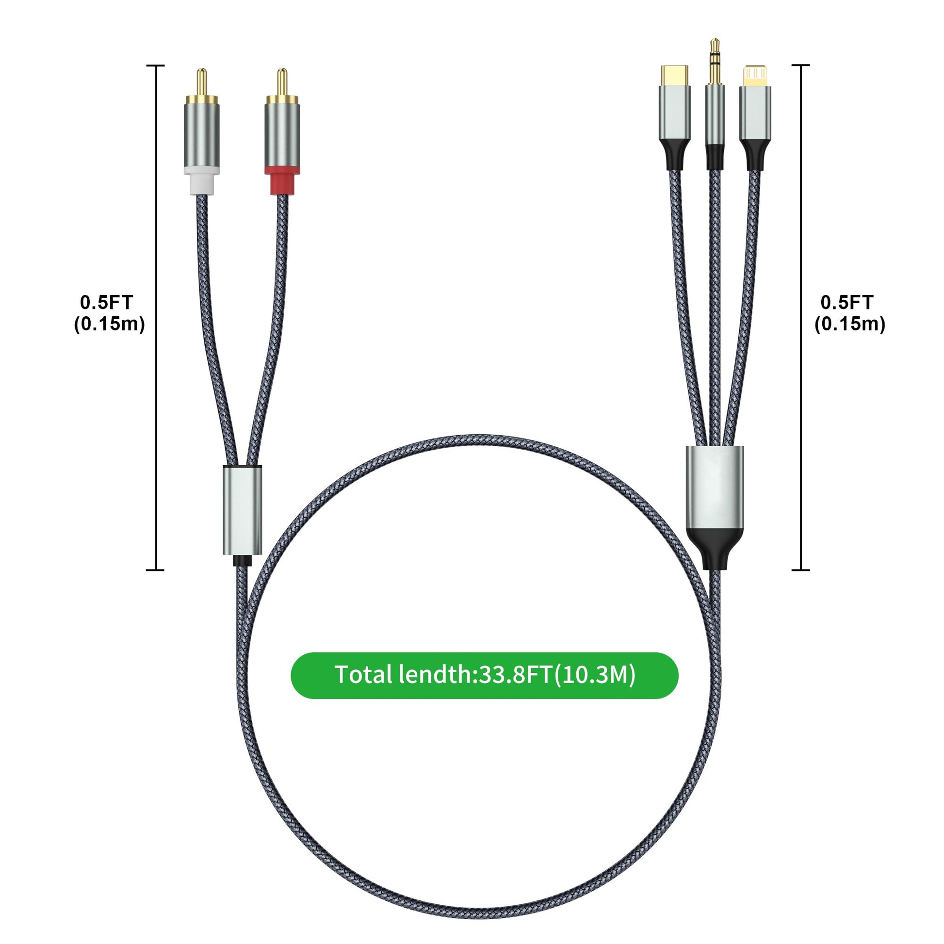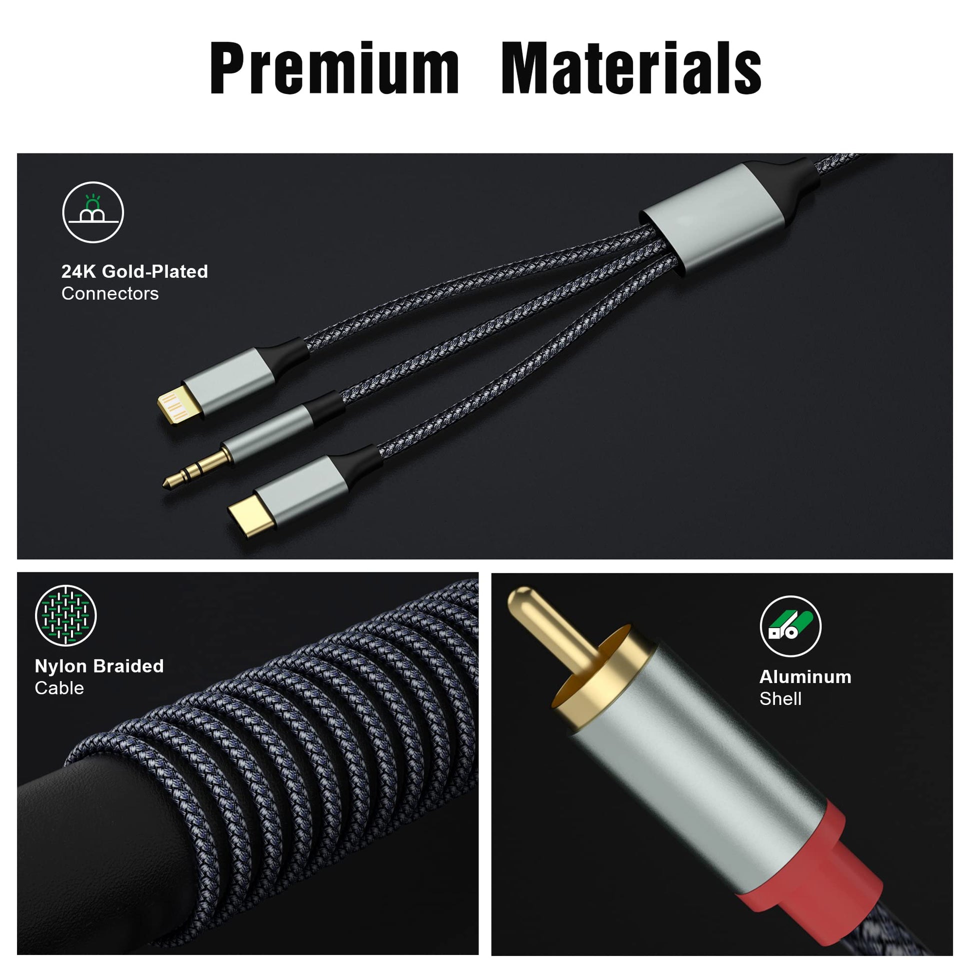 The Apitiong RCA audio connection cable is perfect for connecting a device with a standard 3.5 mm audio jack, a Lightning connector and a USB Type-C connector to a device with an RCA port (for example, speakers, amplifiers, DVDs, TVs).