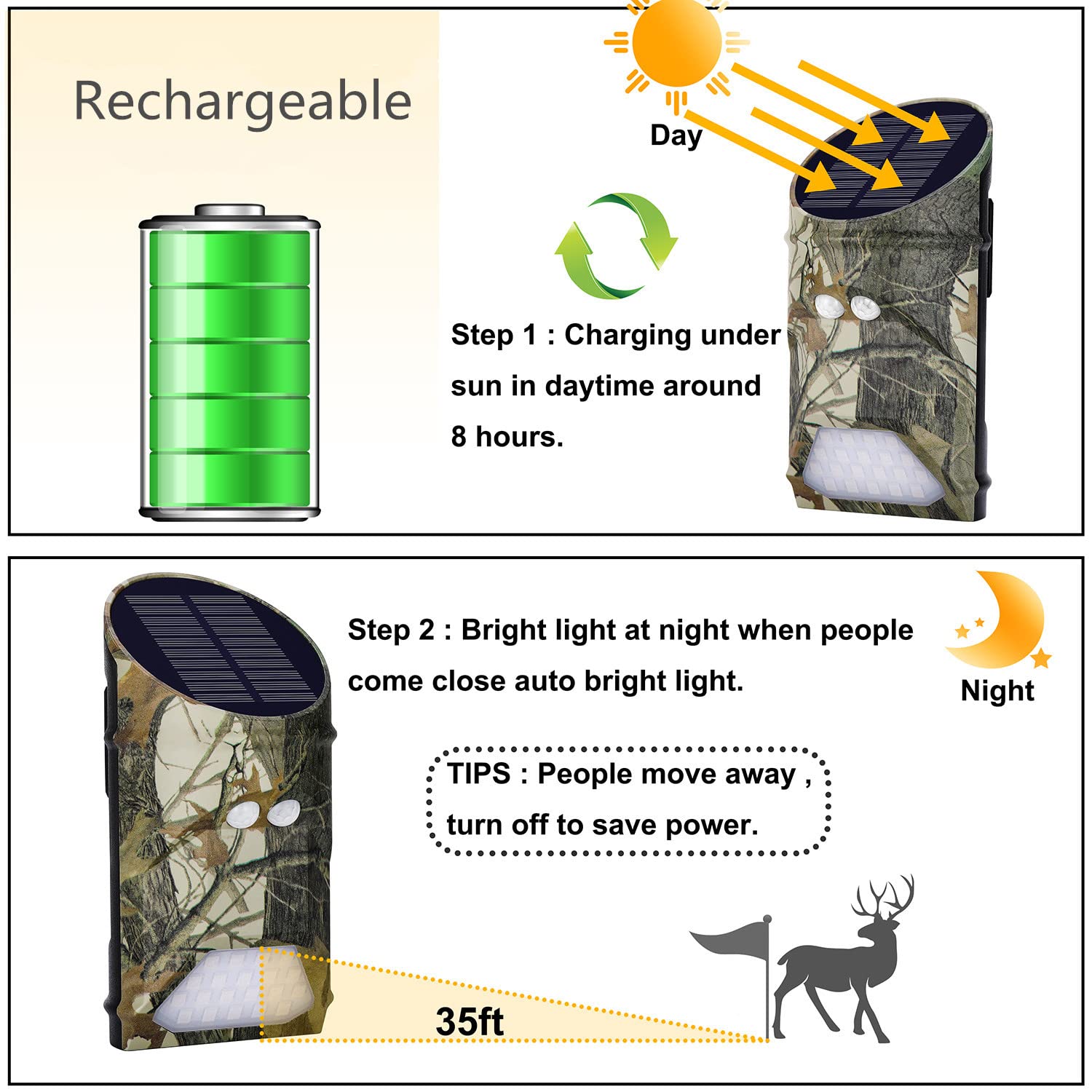 • ✅AUTOMATIC PIR MOTION SENSOR-Motion activated light with 20 green led, it will turn on when people or animals walk close to it at night or dark surroundings, when nobody moves there, light will turn off in 30 seconds to save power, greatly simplifies night hunting by only watch for the light to brighten.