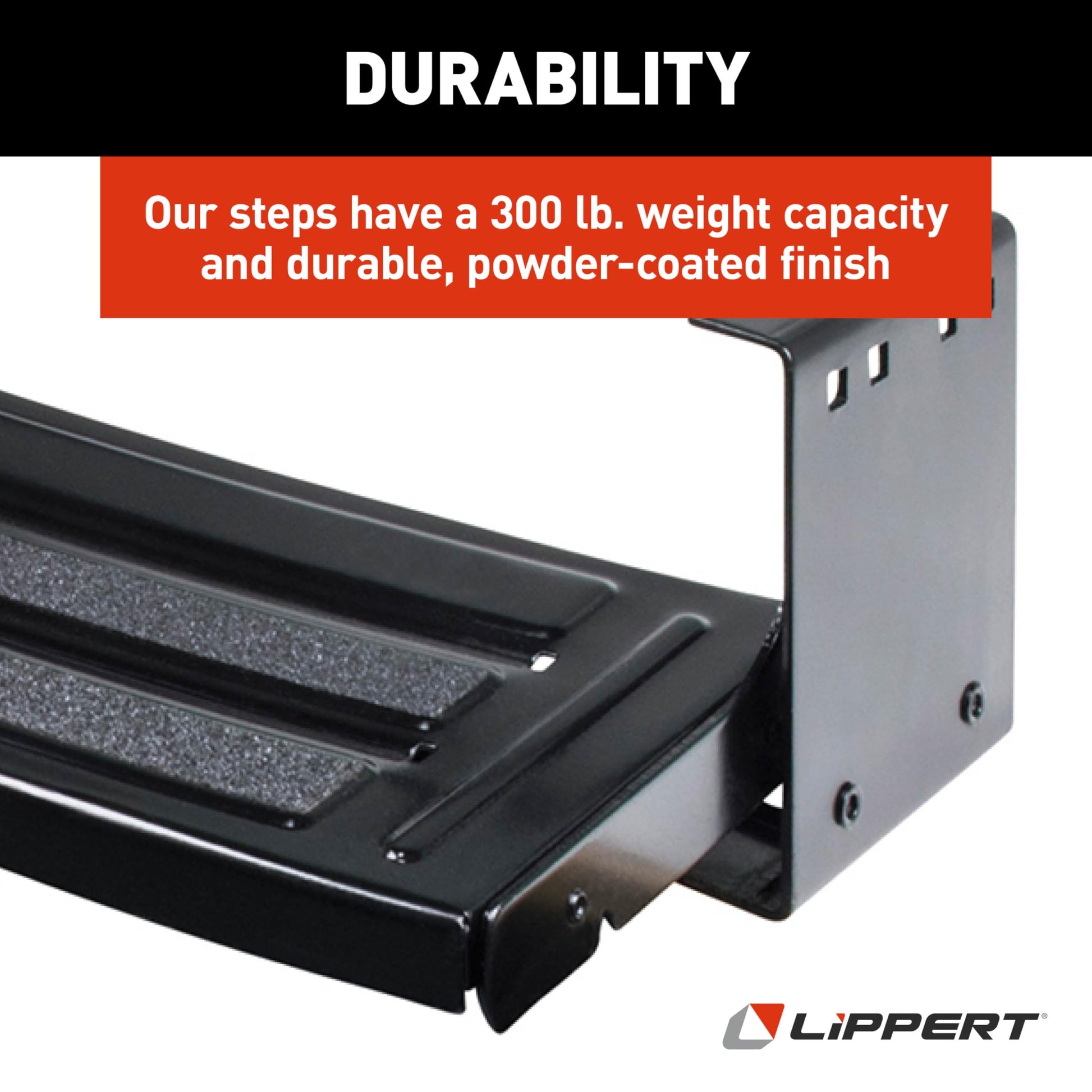 Details: Easy to extend and store the Lippert™ Radius Manual Steps are a durable, safe solution when it comes to upgrading or replacing the steps on your RV. Each step is 24" wide and equipped with anti-slip grip tape for enhanced safety and traction. The compact design also makes it ultra-simple to expand and collapse your steps with just one hand. Plus, our steps are constructed with a black, powder-coated finish so they can withstand all the wear and tear of the great outdoors.The Lippert Radius Manual steps are available in single, double and triple configurations. Each steps is 24" wide and comes with anti-slip grip tape for safety. Our steps have a 300 lb. weight capacity and durable powder-coated finish that can take on outdoor elements.These steps attach to the underside of your RV's chassis, directly beneath your entry door. To choose which size you'll need, measure the width and depth of the space under your RV that lines up with your door frame. To measure how many steps you need, you'll need to know your RV's entry height -- the space between the mounting point and the ground.Whether you’re on the road or on the water, Lippert supplies a broad array of premium RV, towing, and marine products designed to enhance all of your recreational pursuits. Our team is committed to always thinking about your next journey — pushing the possibilities of our products and services, all to better your time spent outdoors, whenever, wherever, for years to come.