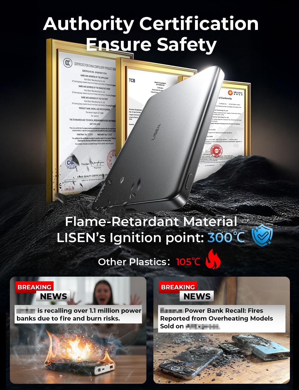 • Durability & Innovation: Strong magnets ensure a secure connection with your phone, while high-end lithium-polymer tech offers long-lasting performance. Features overcharge protection and NTC temperature control for safety.Major brands recall their products due to safety incidents, LISEN, as a responsible brand, strictly controls the quality of each product to ensure that there are no safety problems!