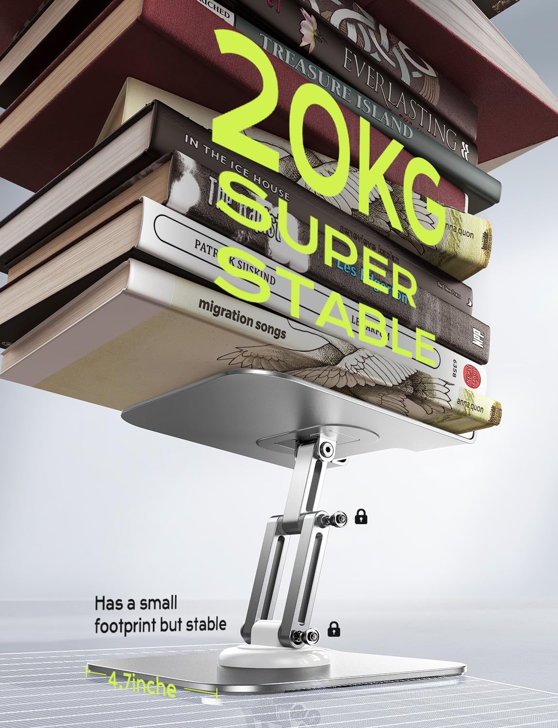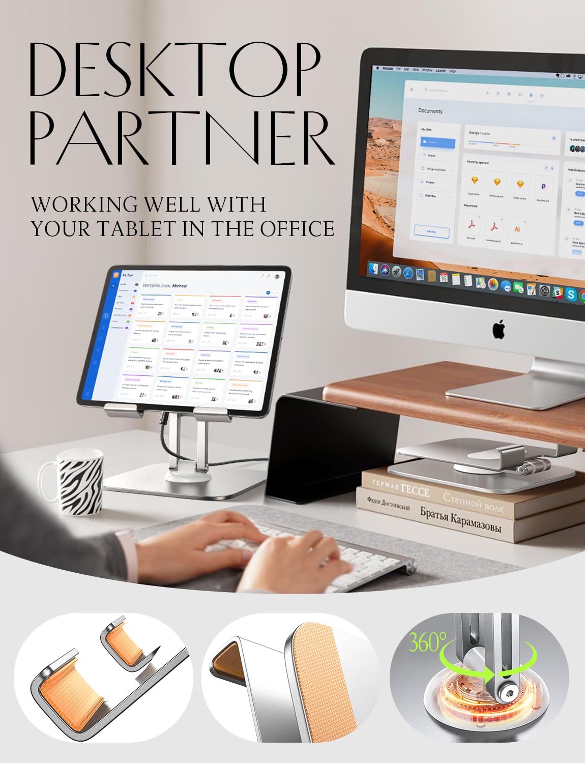 • Tablet Stands 360°of Smooth Rotation Tri-fold Adjustable: Adjust your view to perfection with this new 360°rotatable tablet holder stand for desk. Adjustable hinges provide optimal viewing in either portrait or landscapeposition Whether it's for work, streaming, or video calls, achieve the perfect angle every time. Its innovative adjustment locking mechanism ensures your tablet always stays in place, securely and comfortably iPad holder stand