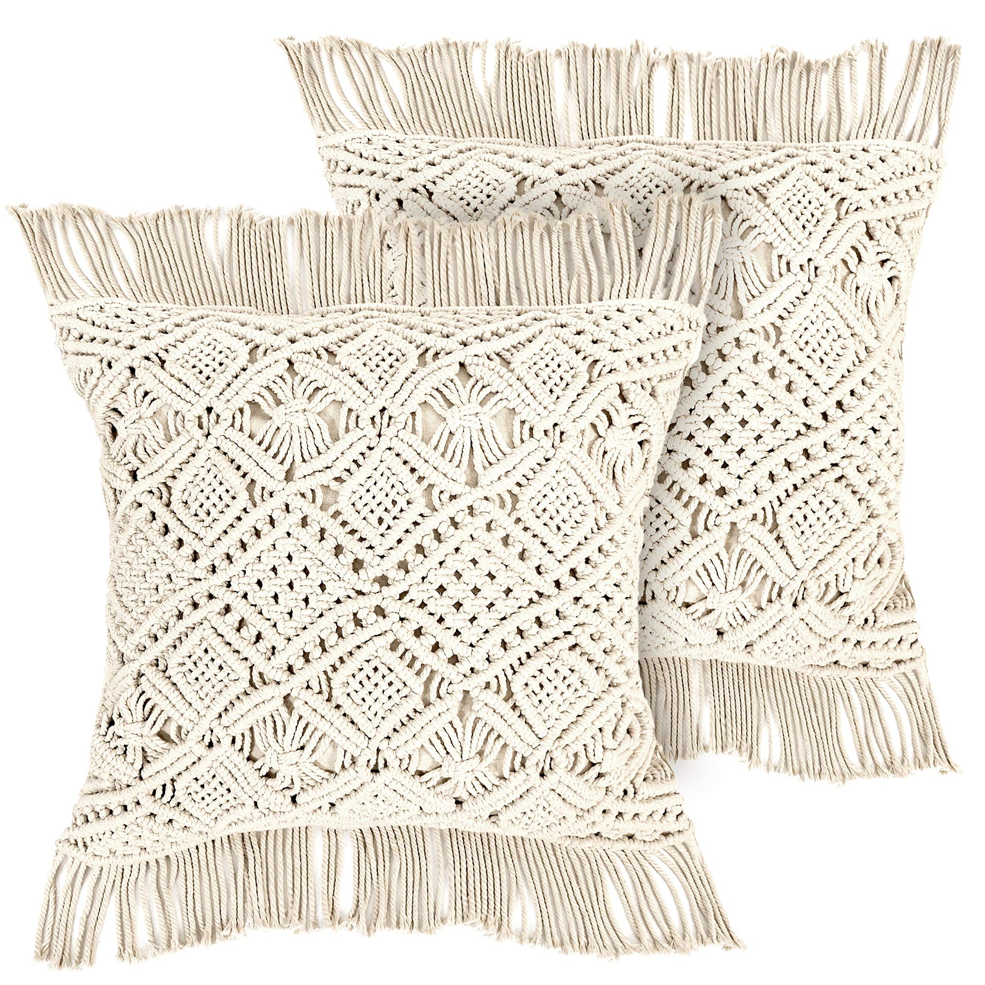 LIVALAYA Macrame Pillow Covers - Set of 2 Ivory Boho Throw Pillow Covers, Farmhouse Woven Bohemian Pillow Cover with Tassels for Bed Couch, Boho Decor Pillows, Decorative Cases for 18 inch Insert