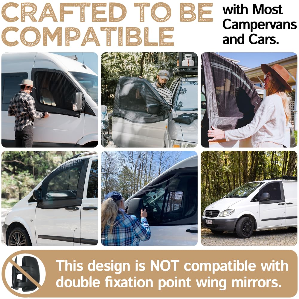 • [UNIVERSAL SIZE] - Fully adjustable car window screens for camping. Works for most cars and vans however please note that this design is NOT compatible with double fixation point wing mirrors. Not to be used while the car is being driven. Also, do not use in rainy conditions.