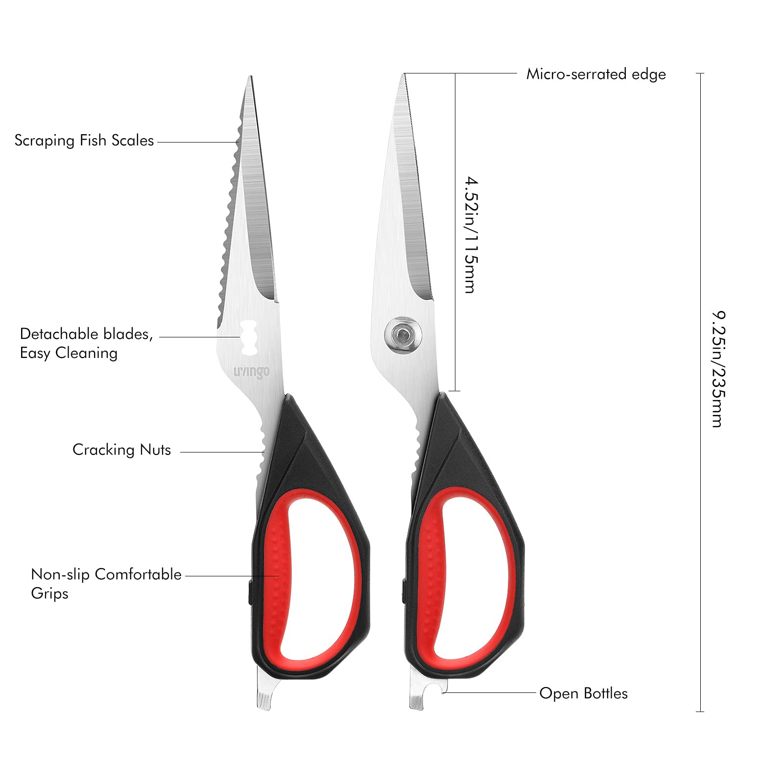 • MULTIFUNCTION DURABLE UTILITY SCISSORS: The serrated edge can scrap fish scales, toothed grip between the handles designed for cracking nuts, plus the tabs at the bottom of the handle can open bottle. Dishwasher safe, hand washing is recommended to retain the fine quality of the blade.