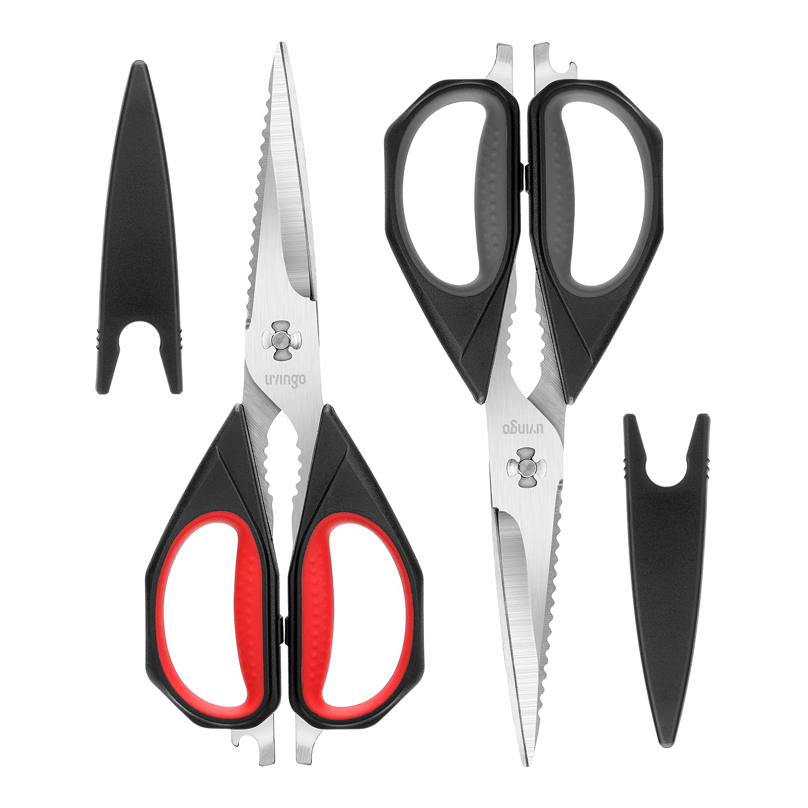 • SHARP & COME APART BLADES DESIGN: The blades of kitchen shears made of premium high-density food grade stainless steel that enables durable, sharp, long cutting life, anti-rust. Plus micro serrated on one blade design enhanced cutting performance for better gripping of slippery materials. meantime, the blades of the kitchen scissors separate easily for washing and resharpening, and with a protective plastic blade guard convenient for storage.