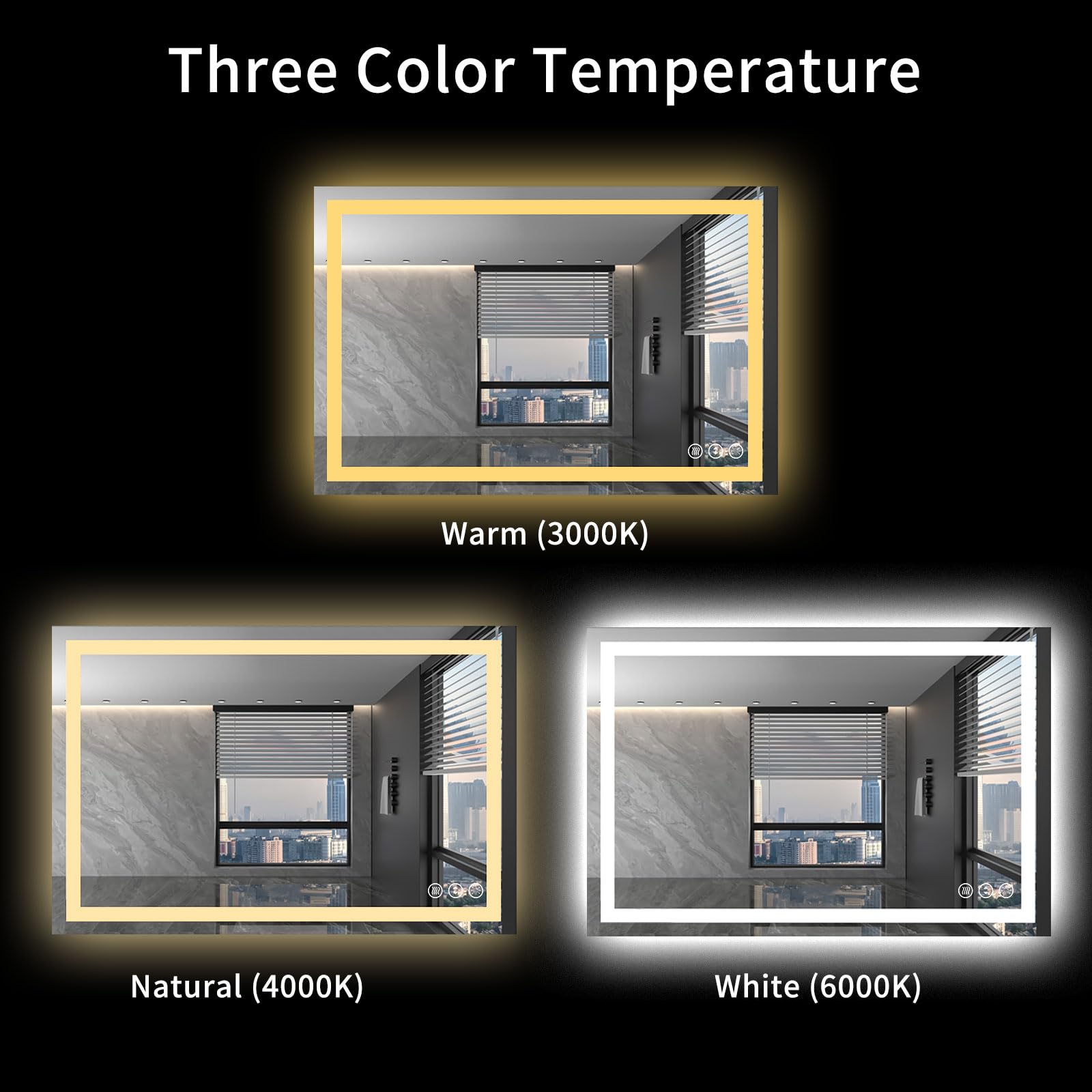 • 【Dimmable & 3 Color Temperature】: The brightness is adjustable for the lighted bathroom mirror; Simply long press the touch switch to adjust the brightness; 3 color temperature for option; warm light (3000 K); natural light (4000 K); white light (6000 K)