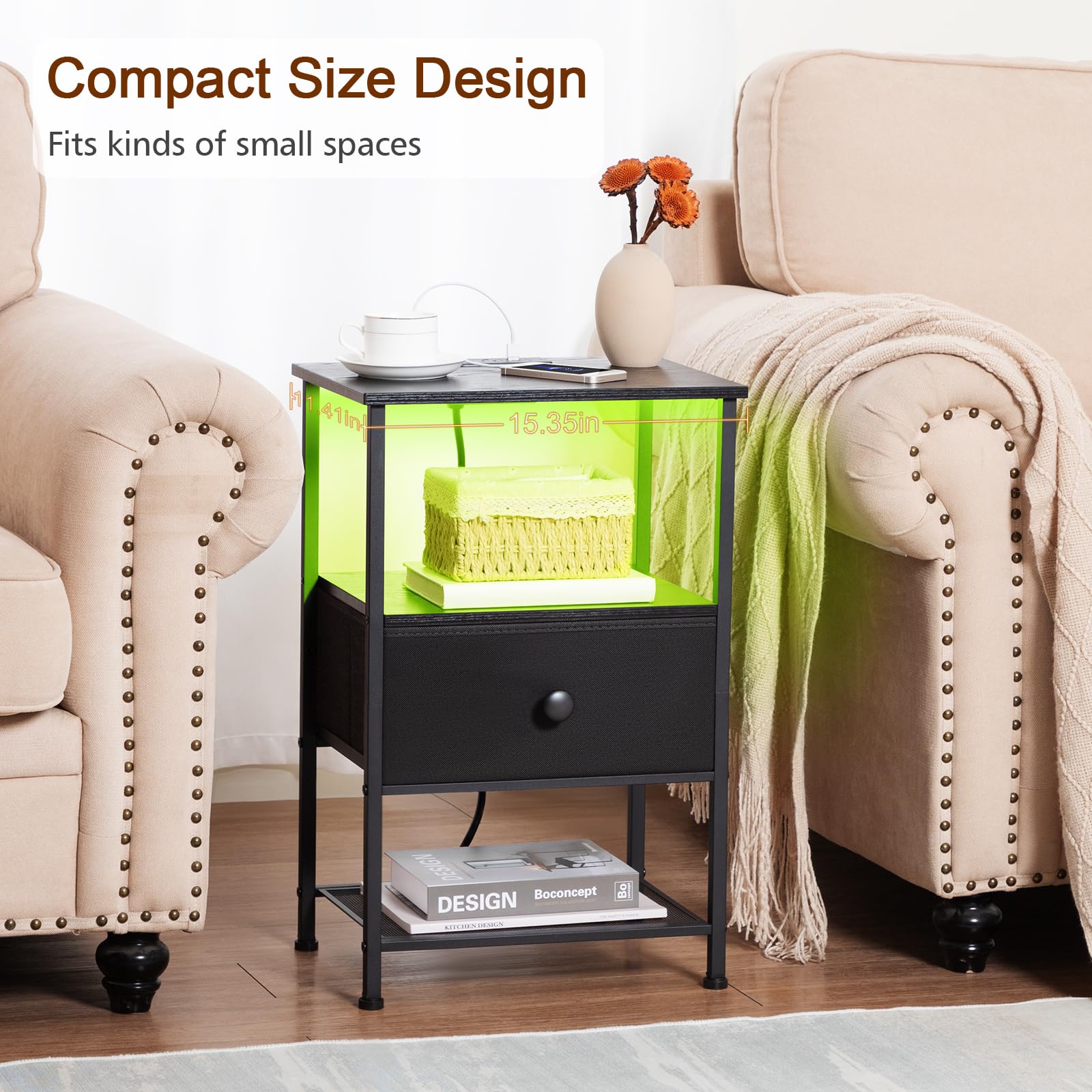 LOAKEKEL Night Stand Set 2, LED Nightstand with Charging Station, End Tables Living Room with Fabric Drawer, Small Side Tables for Bedroom, Small Space, Black, HETS01BK