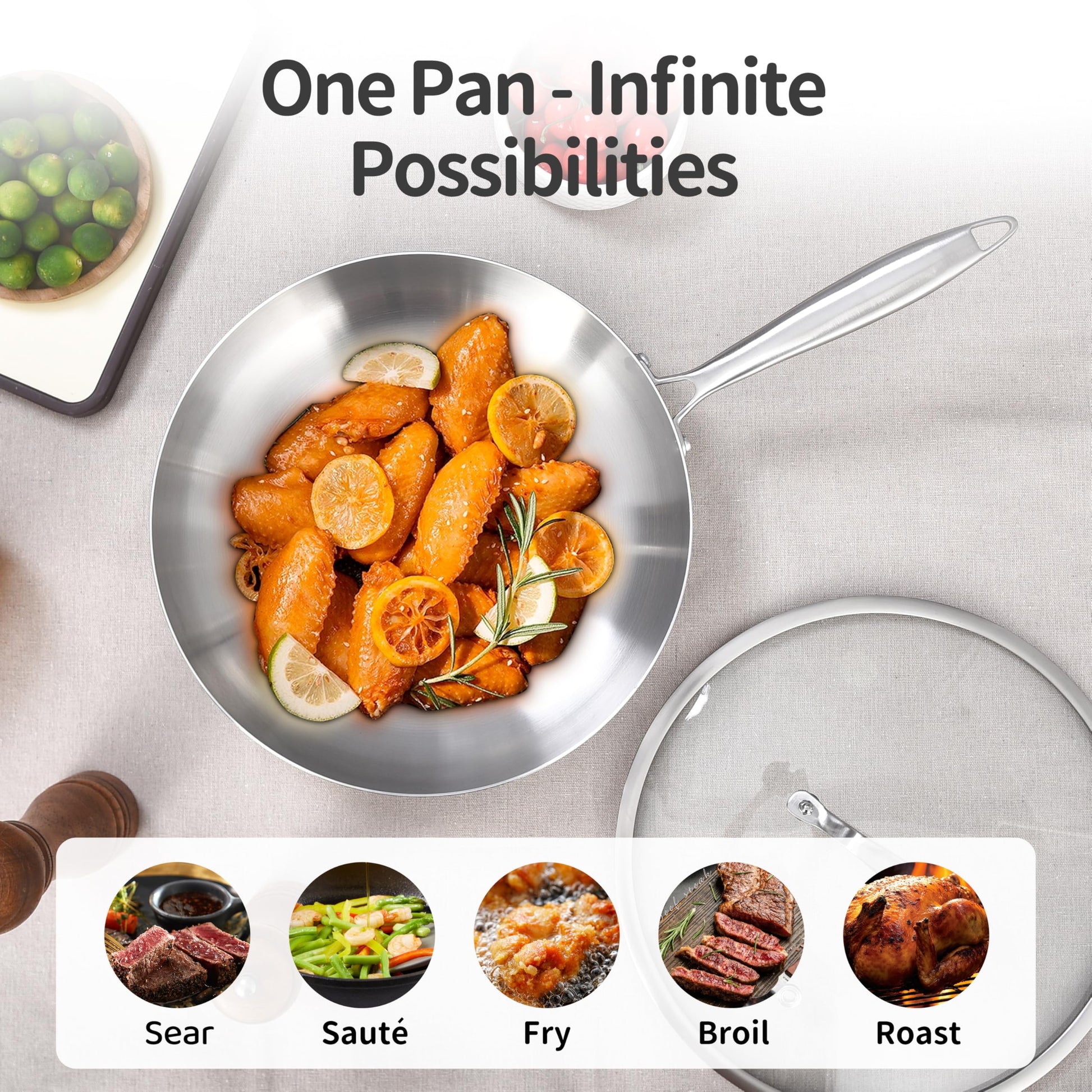 • Premium Tri-Ply Construction:LOLYKITCH panfeatures a high-purity aluminum core sandwichedbetween two layers of durable stainless steel. The 18/0 food-grade stainless steel cooking surface with starburst finish ensures excellent durability non-reactivity with food, and preserves naturalflavors.