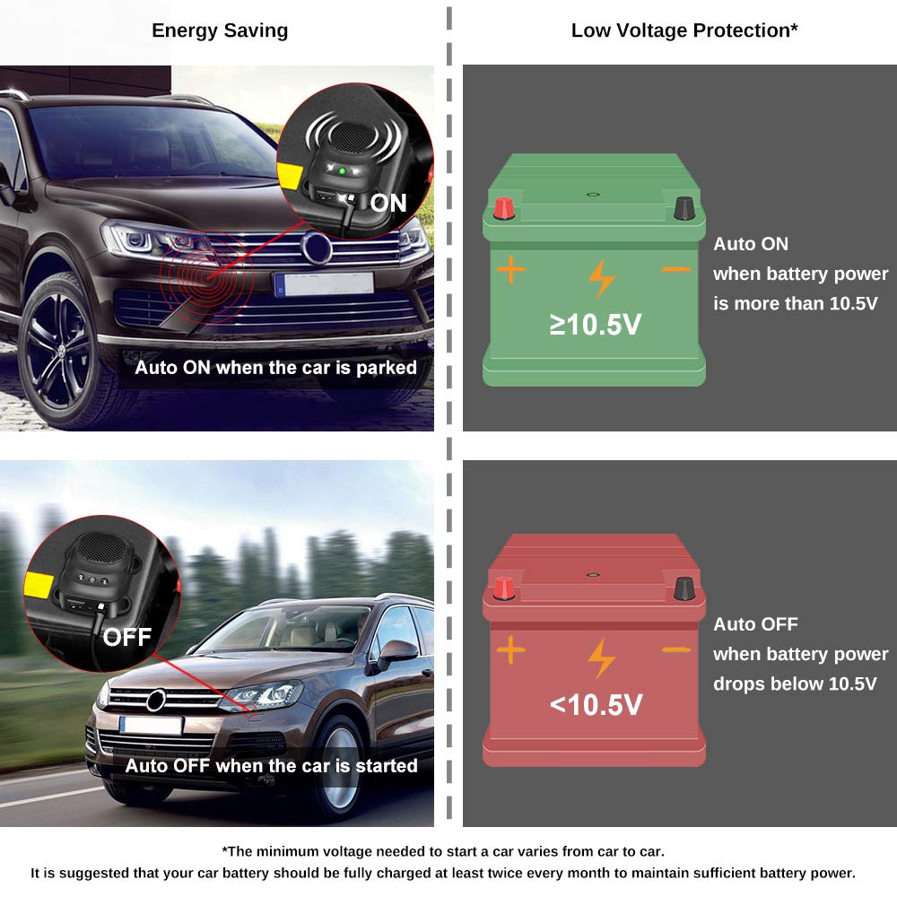 • Low Voltage Protection: This rodent repellent is equipped with low voltage protection that automatically stops working when the battery voltage drops below 10.7 volts (±0.2 volts). This feature protects your car's battery from being drained and ensures the device is always ready to perform when you need it.