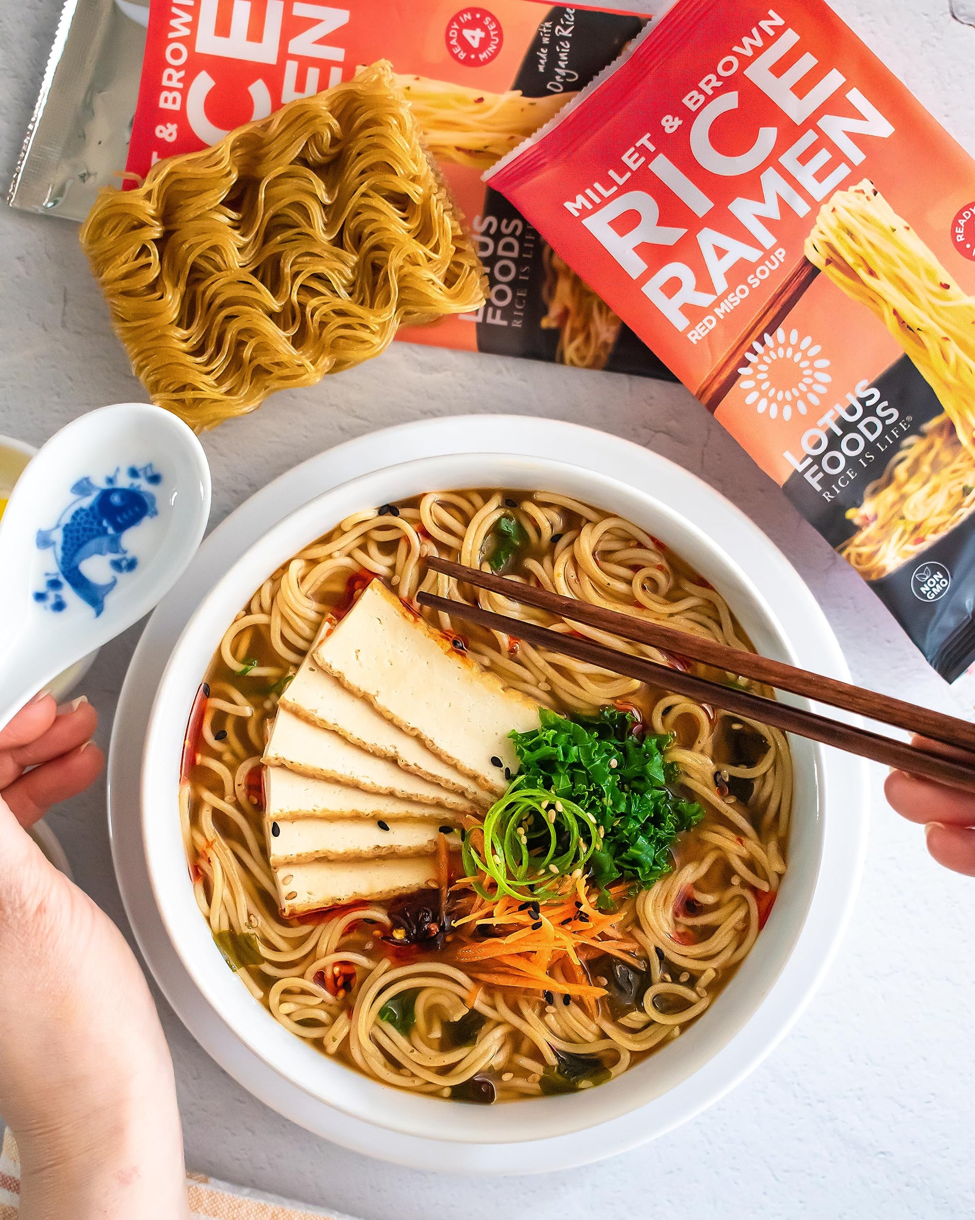 Details: Our best-selling ramen is made from organic millet and brown rice paired with flavorful red miso broth with wakame and a hint of heat. In addition to being gluten free, millet and brown rice are some of the most nutritious and easily digestible grains. Millet & Brown Rice Ramen noodles have a delicious nutty taste and are a good source of fiber and protein. Ready to eat in just 4 minutes - perfect for a quick meal on the go! For a complete meal, add in your favorite protein and veggies.