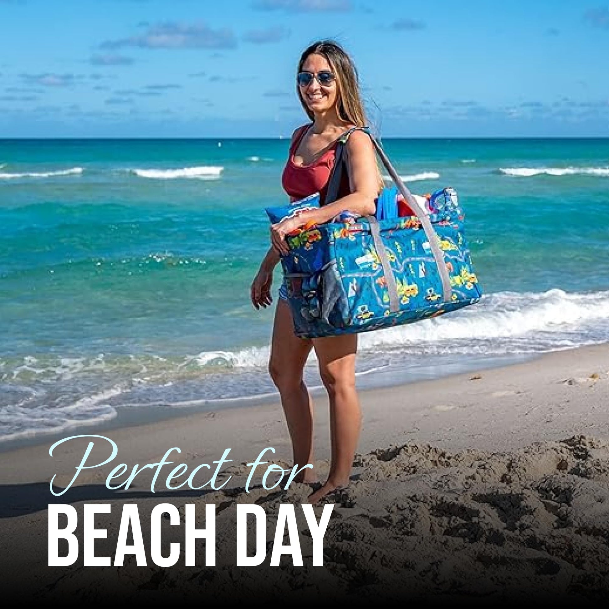 • Lots of Room - Easily fits eight beach swim towels in the giant canvas utility bag with room for suncreen, goggles and beach toys in the two outside pockets.