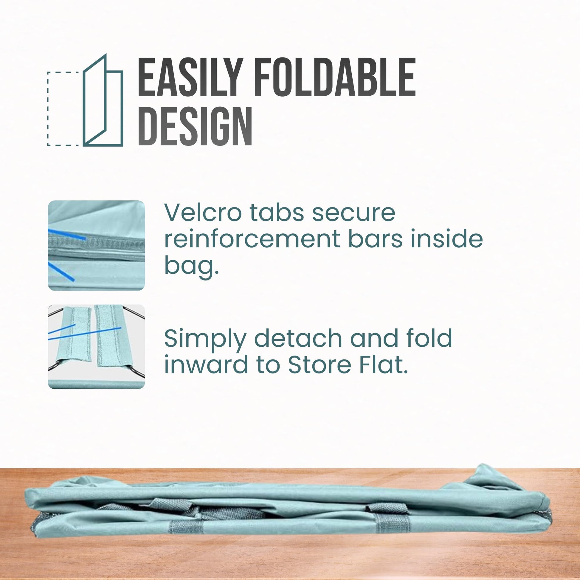 • Premium Quality - Made from durable water-resistant polyester with metal wireframe, it is light to carry and very durable. Quickly collapses with one long velcro strap on each interior side compared to two tiny flimsy velcro straps our competitors have. Will hold up to roughly 25 pounds of items in the bag.