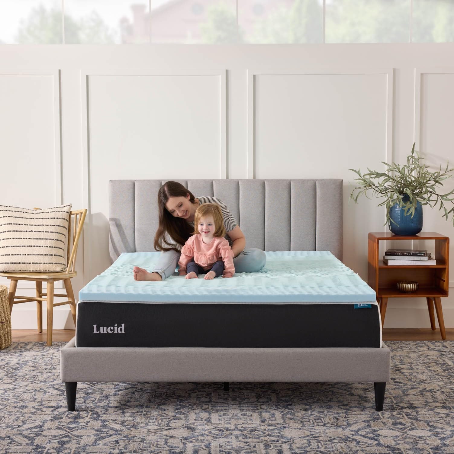 Details: At Lucid, we make beds for the whole family — because when you wake up feeling your best, your family gets the best version of you too. The Lucid 5 Zone Gel Memory Foam Mattress Topper is an affordable way to soften a too-firm mattress, revitalize and old mattress, or prolong the life of a newer mattress. This responsive memory foam layer cradles your body with a soft “sink-in” feeling while five specialized comfort zones target the pressure points in your body to relieve aches and pains for a great night’s sleep. Plus, this versatile topper can be used zoned side up for a targeted and plusher feel or zoned side down for a more even and firm feel that still provides plush, zoned support. This bed topper is also infused with cooling gel to help regulate body temperature by dissipating heat. Available in a plush 2-inch profile and even plusher 3-inch profile, this topper is designed to perfectly align with most standard size mattresses and is shipped right to your door in an easy-to-carry box.